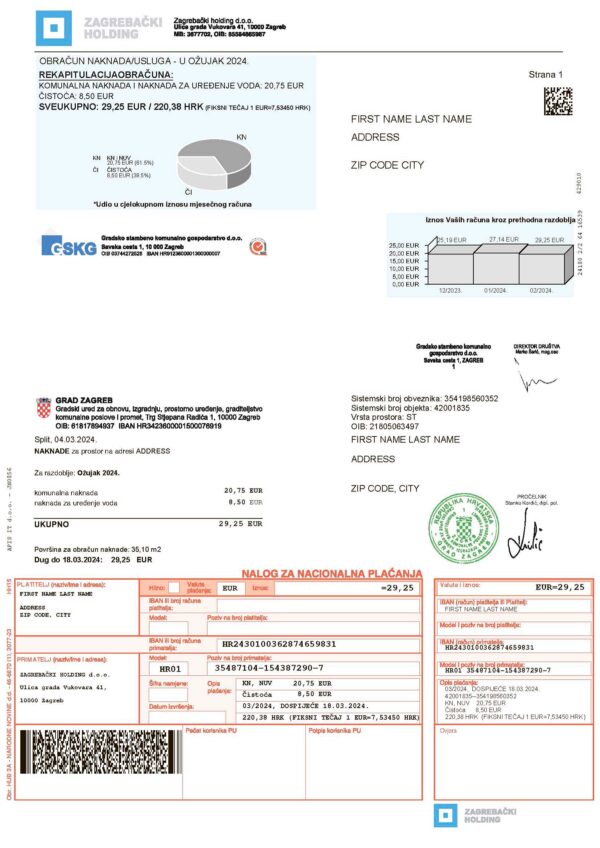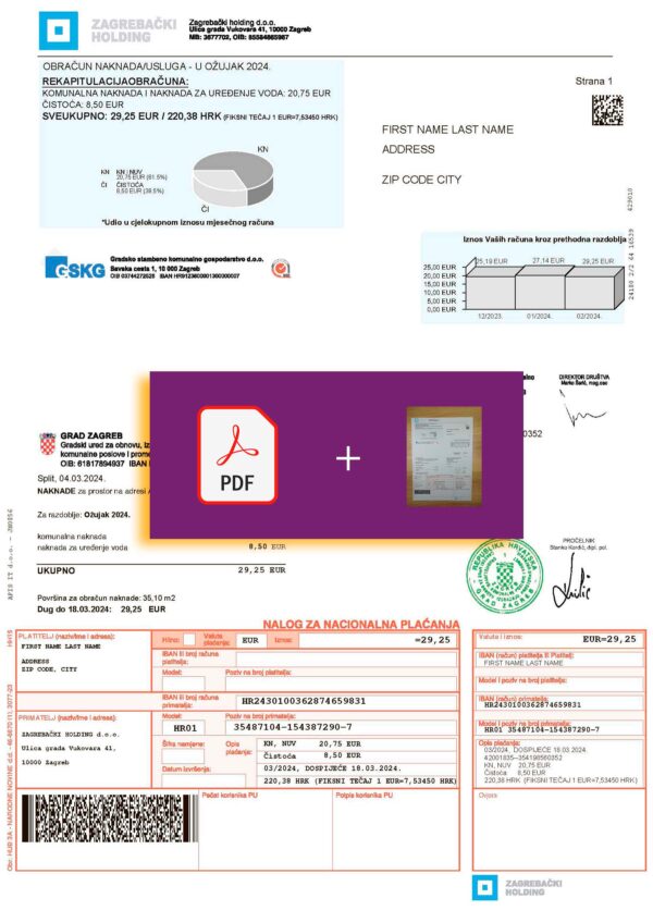 You’ll receive your order in PDF or JPEG formats at 300 DPI resolution, with a design that aligns with the standard layout used in Croatia. The template includes editable areas for name, service address, billing cycle, usage details, and total amount. Each purchase includes free revisions until final approval, delivery within 24 hours, secure checkout, and dedicated 24/7 support for peace of mind.