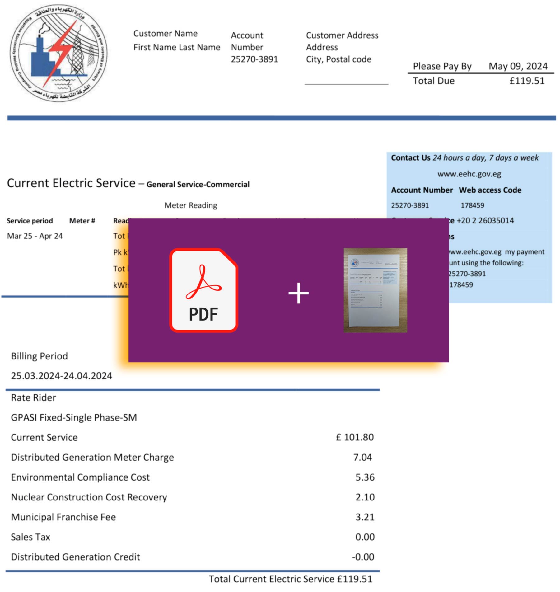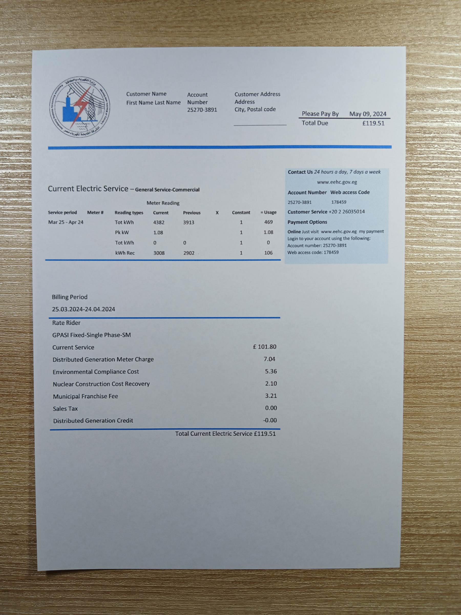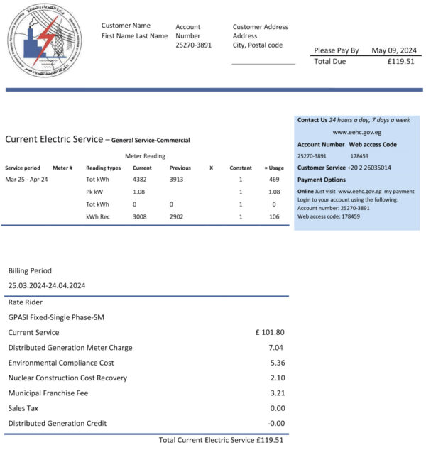 This package includes JPEG or PDF + JPEG formats in 300 DPI print resolution. The layout mirrors the official Egyptian electricity format, including editable sections for customer name, service address, billing period, usage data, and total charges. You’ll also receive secure checkout, free revisions until approval, 24-hour turnaround, and 24/7 customer support for complete reliability.