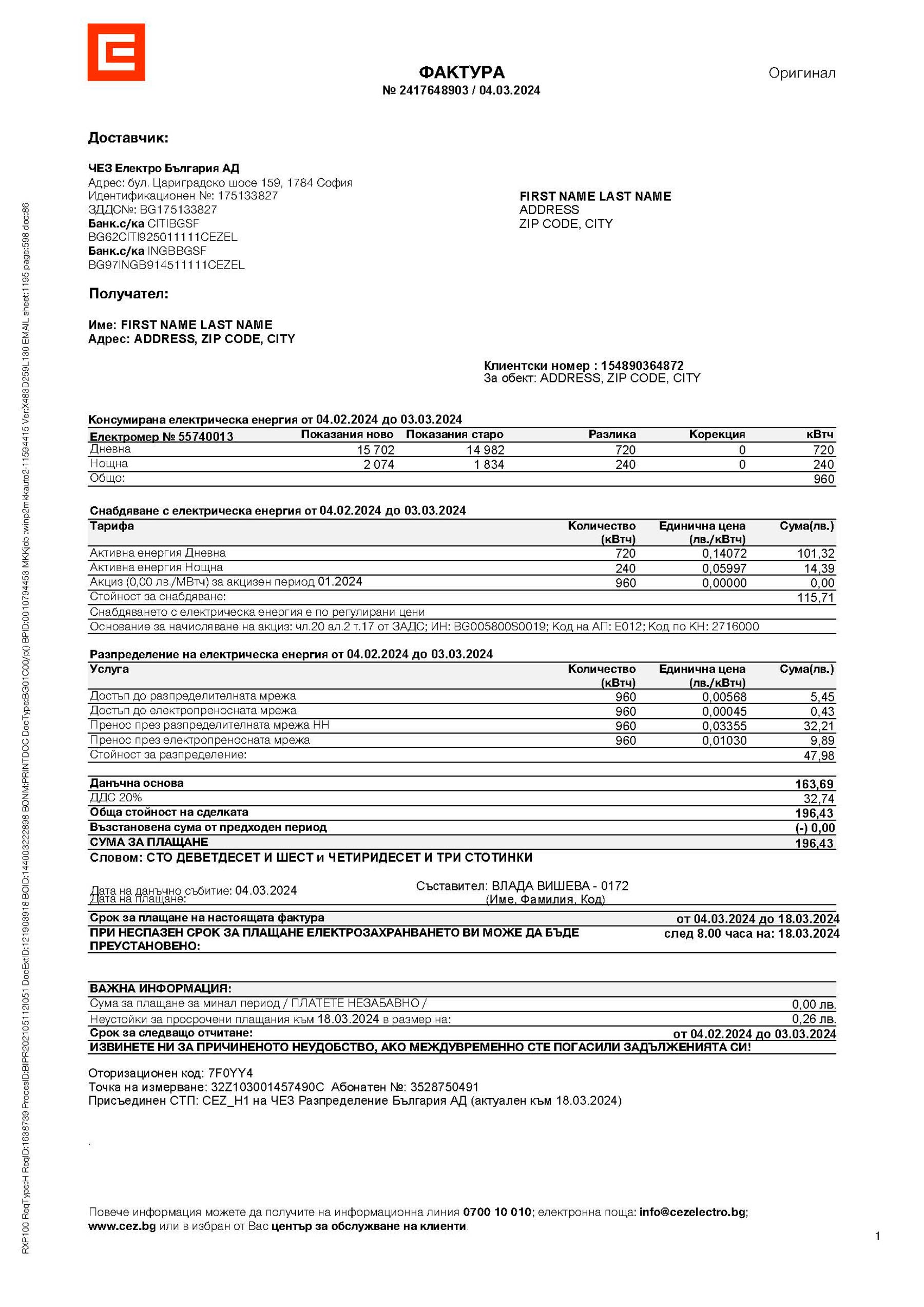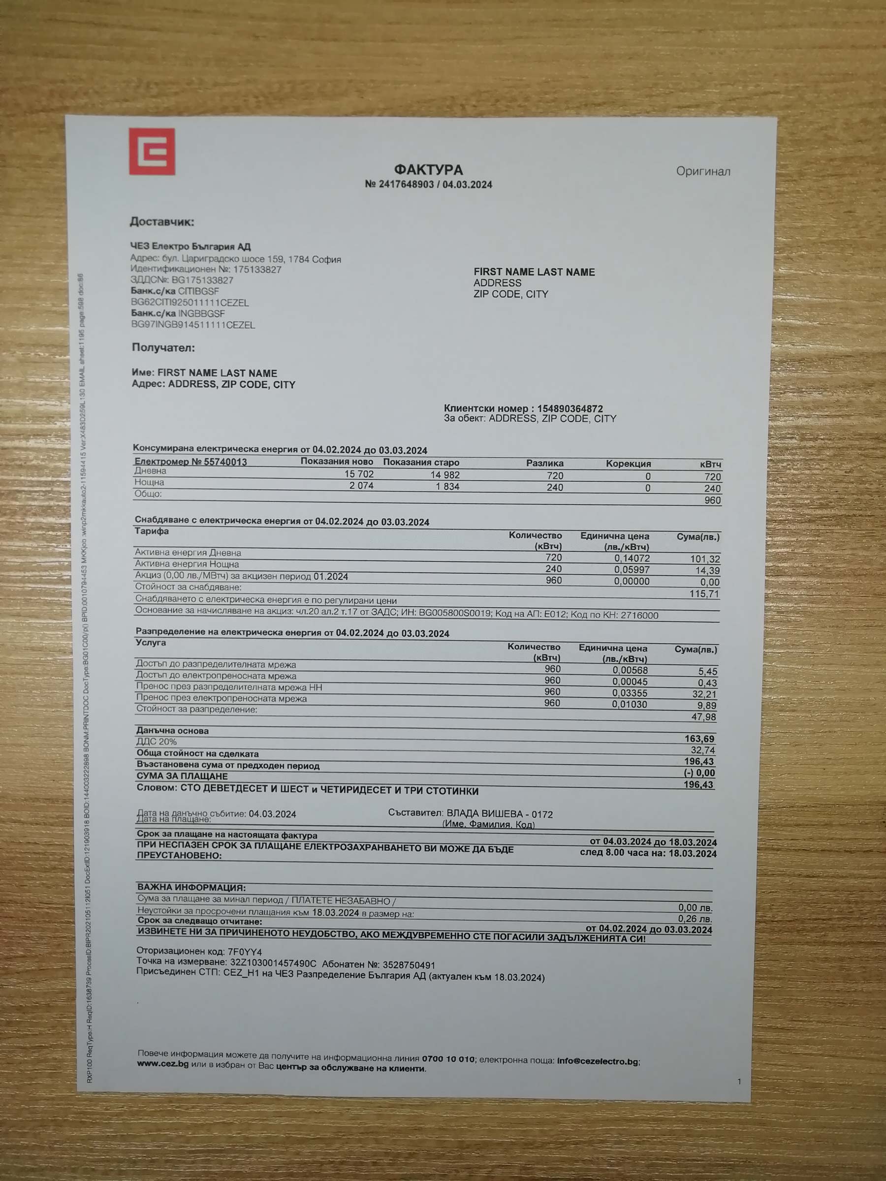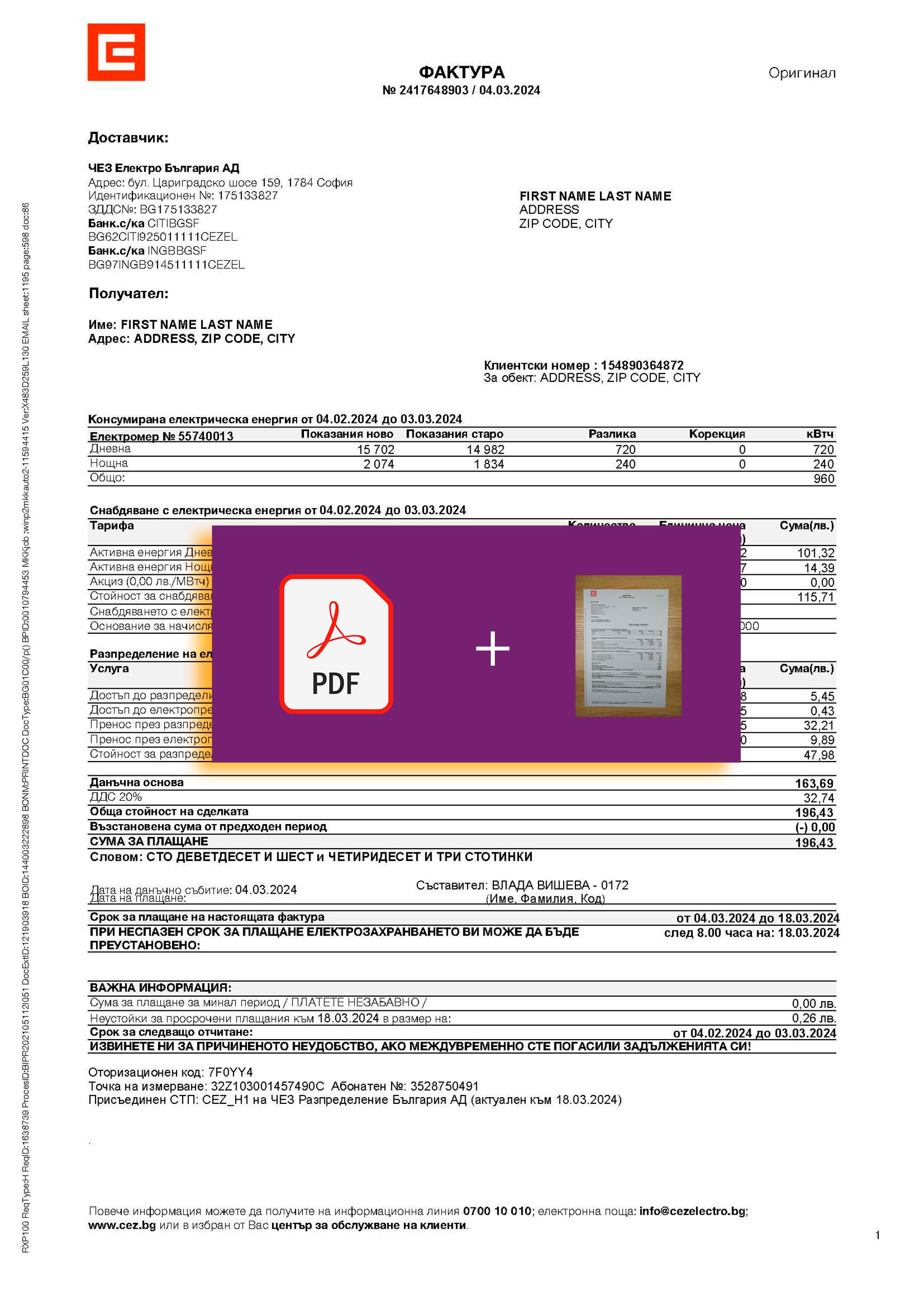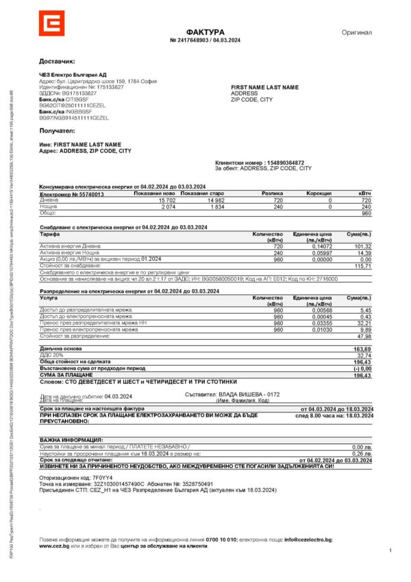 Your package includes both PDF and JPEG formats, each rendered at 300 DPI for sharp clarity. The structure aligns with standard Bulgarian electric billing layouts and includes editable elements such as name, billing period, address, and payment totals. Orders are completed within 24 hours, include free revisions until approval, and come with secure checkout and 24/7 customer support.