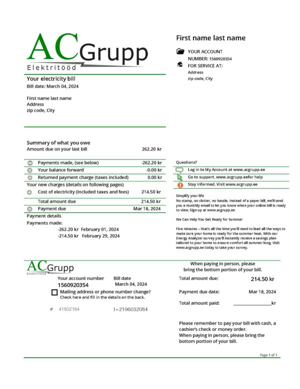 You’ll receive both PDF and JPEG versions of the file in 300 DPI for maximum clarity. The design is aligned with standard electric billing layouts used in Estonia and includes editable fields like customer name, address, billing cycle, and total amount due. Delivery is completed within 24 hours, with free revisions until final approval, secure checkout, and 24/7 support for smooth communication at every step.