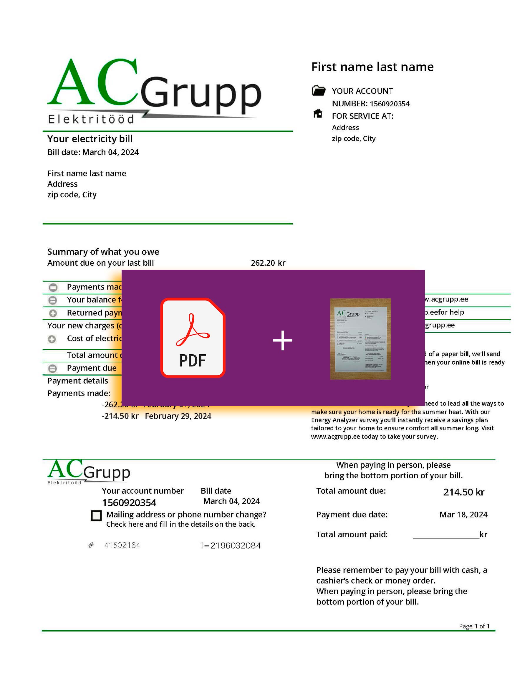 This editable Estonia electric utility bill sample offers a precise, high-resolution (300 DPI) layout crafted for simulations, documentation reviews, and compliance purposes. It captures the authentic structure of Estonian electricity billing, including editable areas such as customer details, service address, billing period, meter readings, and payment totals. With a Done-For-You approach, everything is handled by professionals—perfect for designers, developers, and compliance teams seeking realistic, editable billing visuals for KYC or proof-of-address scenarios.