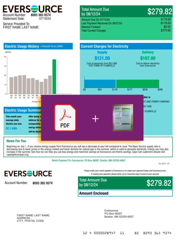 You’ll receive your Eversource Connecticut statement in JPEG or PDF + JPEG formats. The layout replicates the provider’s real structure, including editable sections for customer name, address, meter readings, billing period, and totals. All files are produced in 300 DPI print-ready quality and come with free revisions until approved, secure checkout, 24-hour turnaround, and 24/7 customer support.