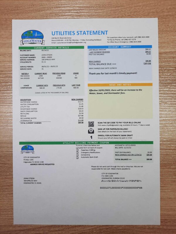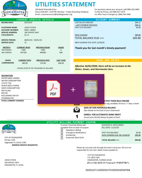 The package includes both JPEG and PDF versions formatted at 300 DPI. The layout reflects the genuine City of Edgewater bill design with editable fields for customer name, address, billing cycle, account number, and total amount due. You’ll receive secure checkout, free revisions until approval, guaranteed 24-hour turnaround, and 24/7 customer support to make the process effortless.