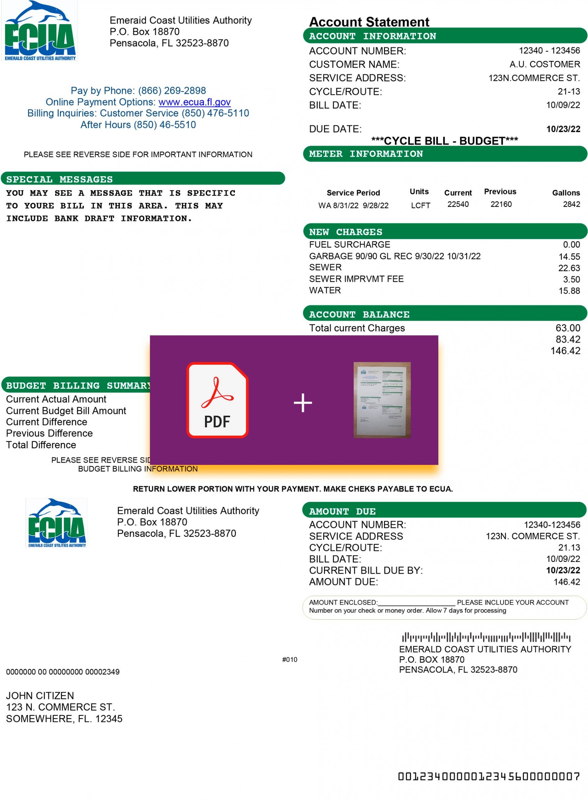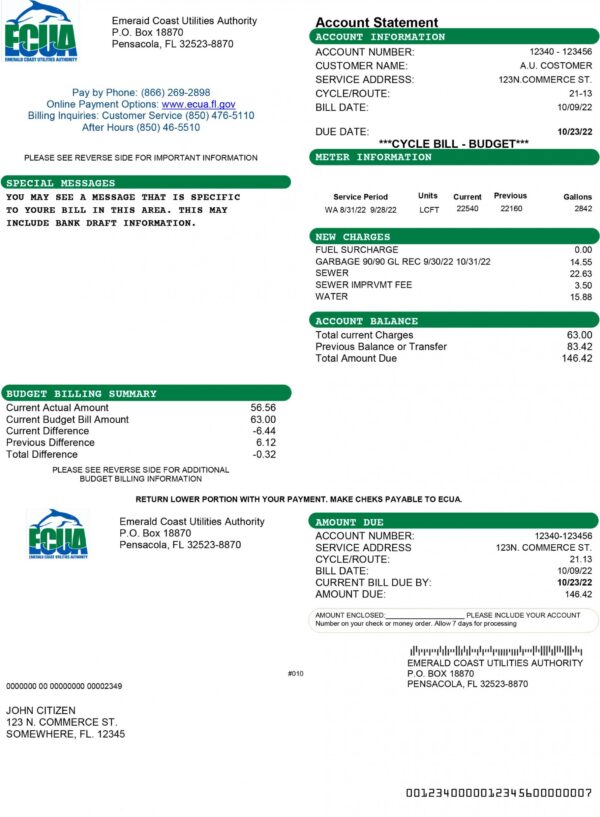 The ECUA Florida water bill layout complements the Tallahassee utility design and the Pensacola Energy bill, both built for realistic proof-of-address representation and editable UX purposes.