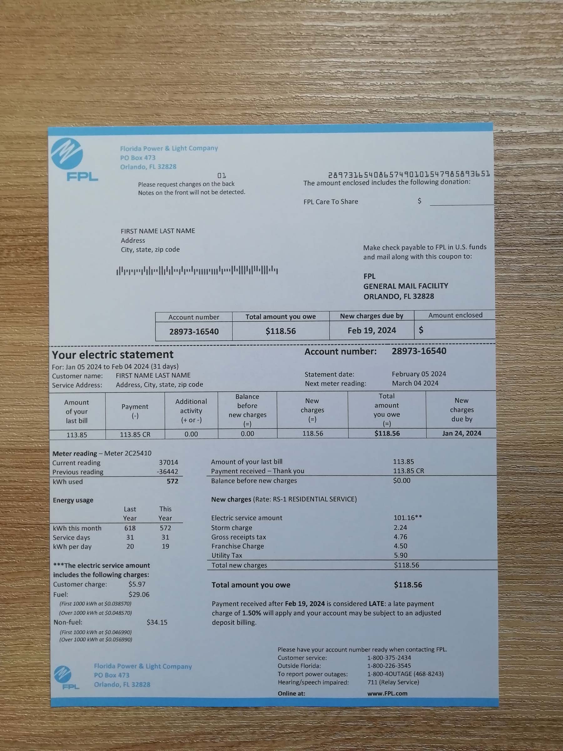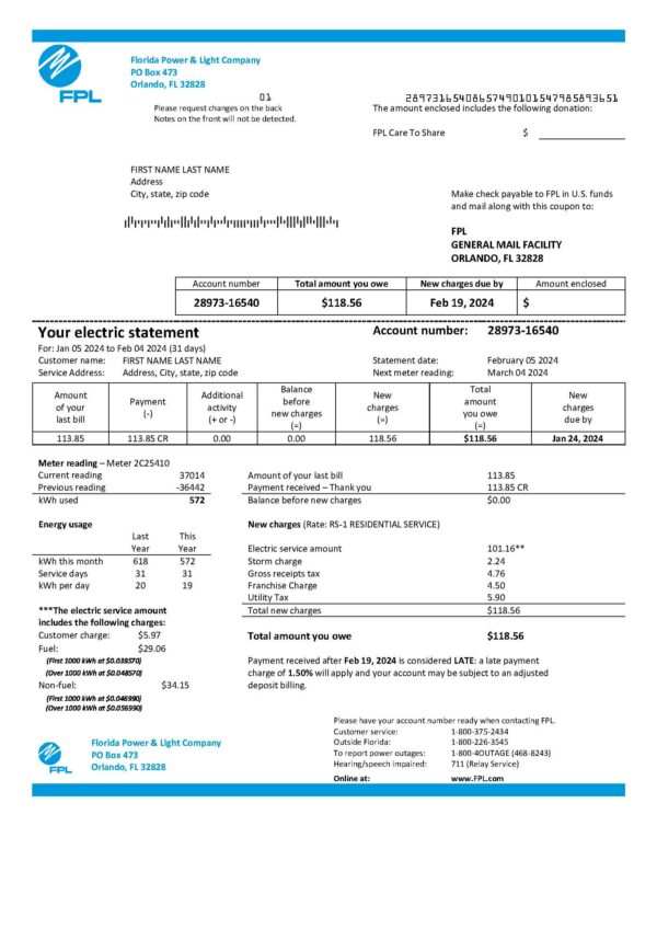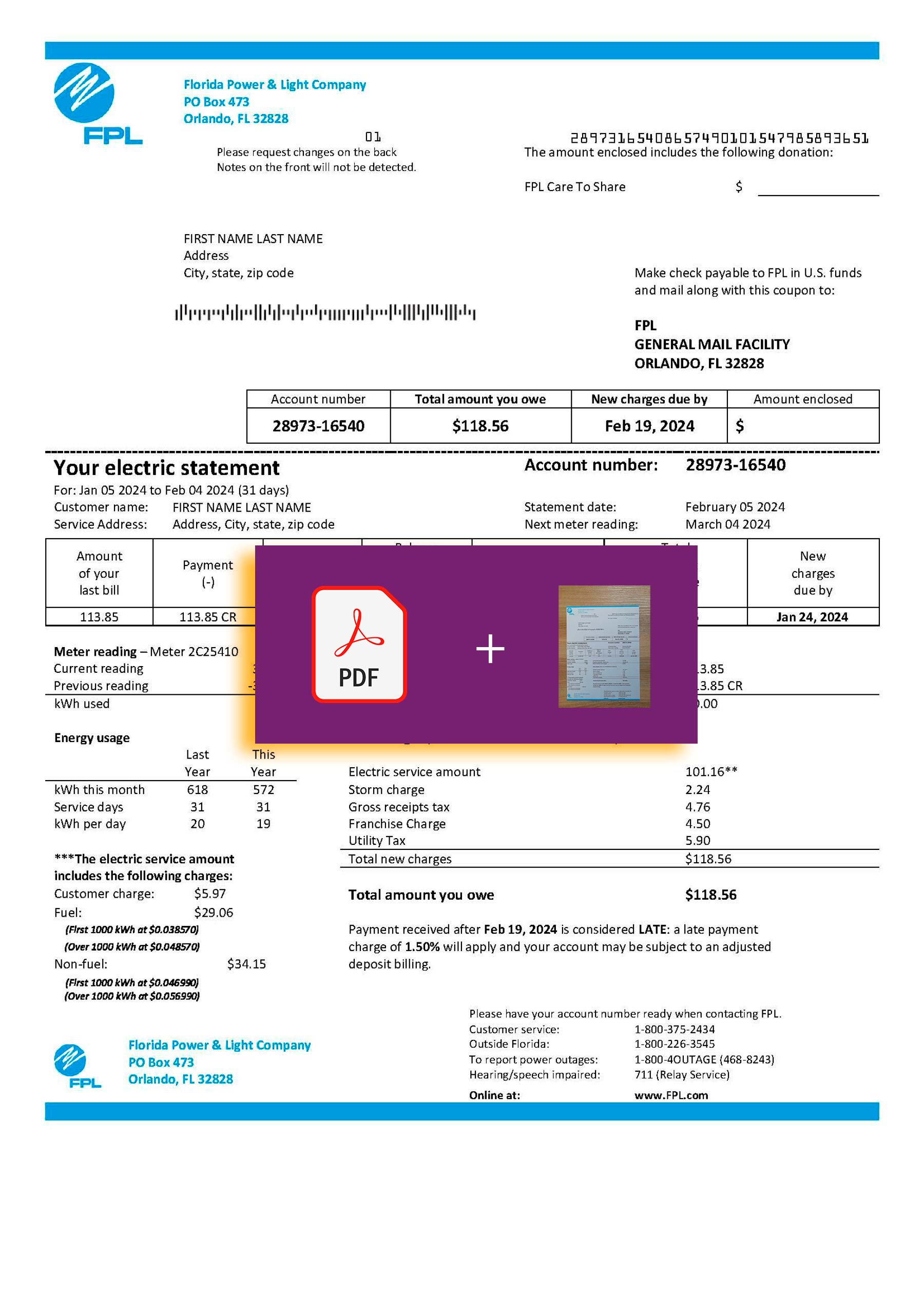 Your purchase includes both PDF and JPEG versions, professionally formatted and high-resolution. The design mirrors the layout of typical Florida power statements and includes editable fields such as customer name, address, account number, billing cycle, and total amount due. You also receive secure checkout, free revisions until approval, and fast delivery within 24 hours — supported by our 24/7 design assistance.