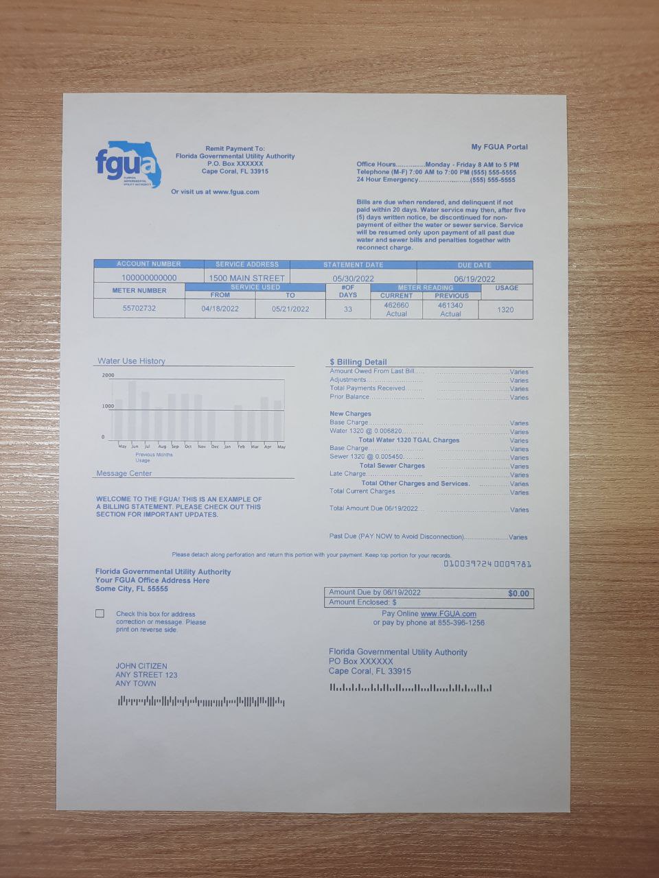 You’ll receive editable versions in both PDF and JPEG formats, prepared at 300 DPI for crisp print or digital display. The layout follows the official FGUA design and includes editable fields such as customer name, service address, billing period, account number, and total balance. Every order comes with secure checkout, free revisions until approval, a 24-hour turnaround guarantee, and full 24/7 customer support.