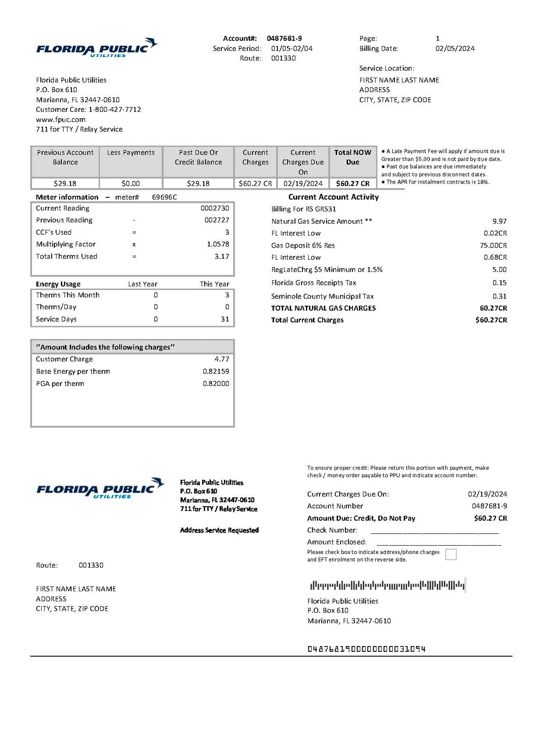 The Florida Public Utilities bill layout offers editable and visually accurate formatting. You can also check the Florida electricity statement or the FGUA Florida template for related 2025-ready designs.