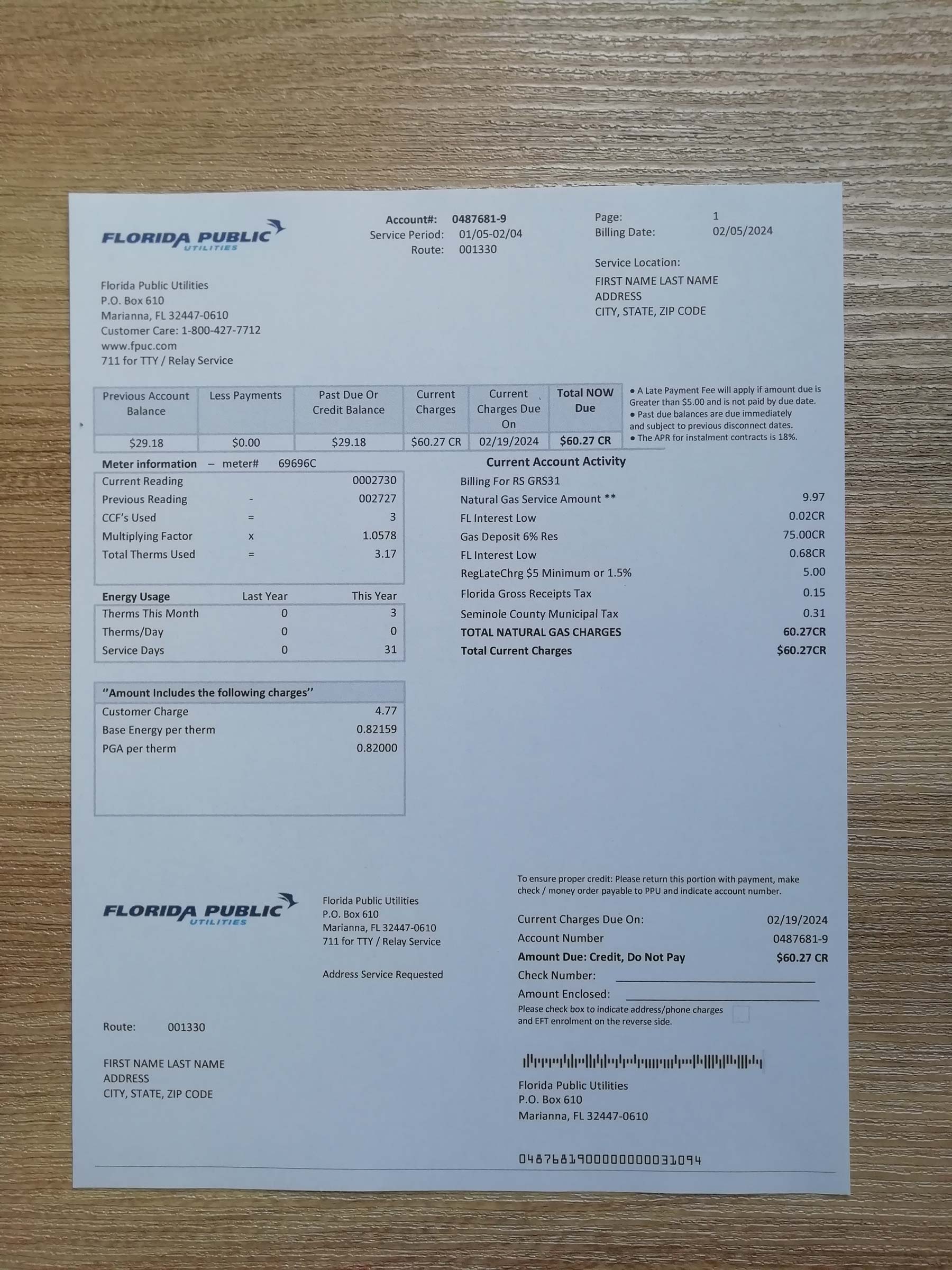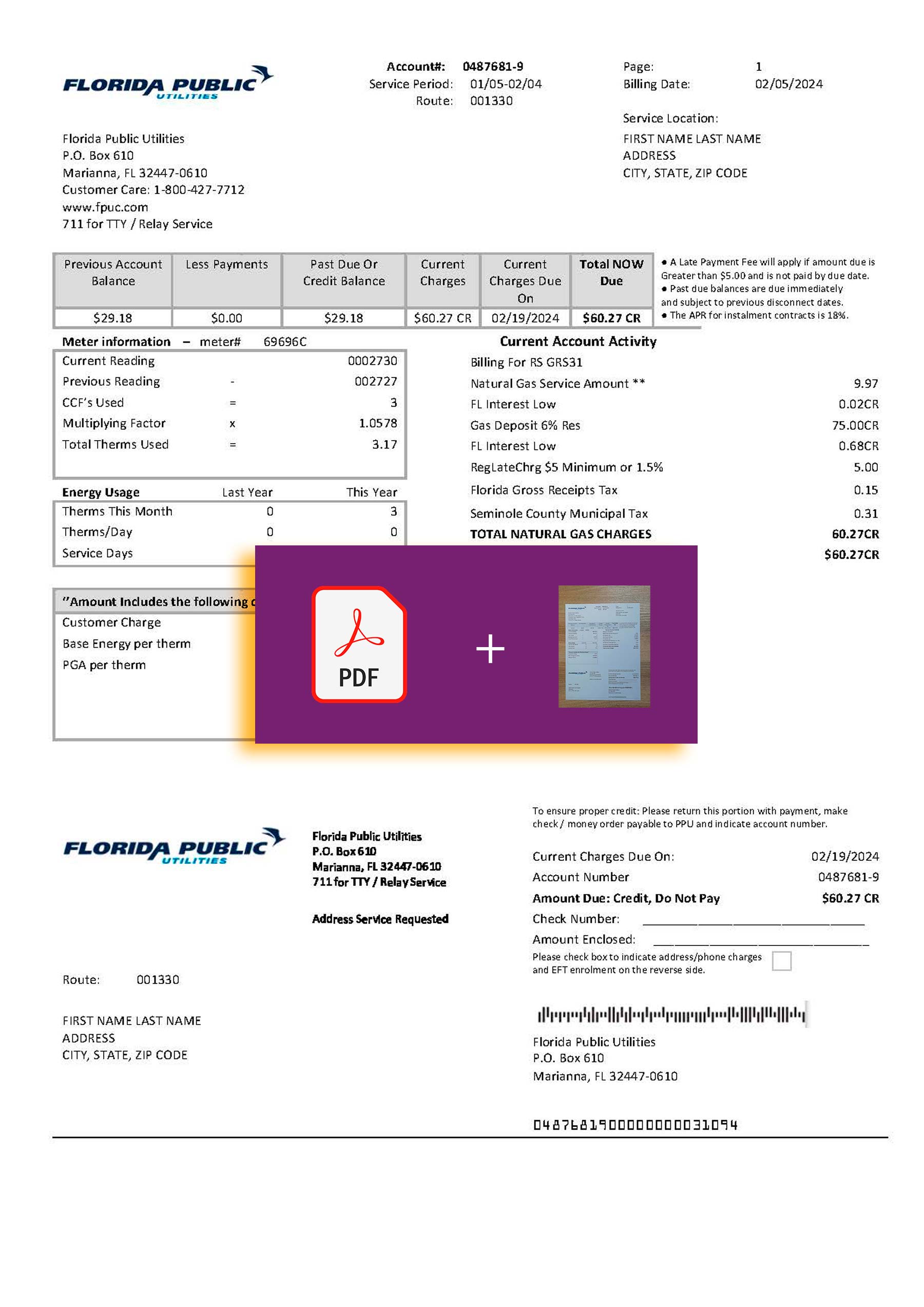 This downloadable package includes PDF and JPEG formats in 300 DPI quality, matching Florida Public Utilities’ typical bill layout. Editable areas cover customer name, service address, billing cycle, and usage totals. You’ll receive secure checkout, free revisions until approved, guaranteed 24-hour delivery, and around-the-clock support to ensure a seamless experience from start to finish.