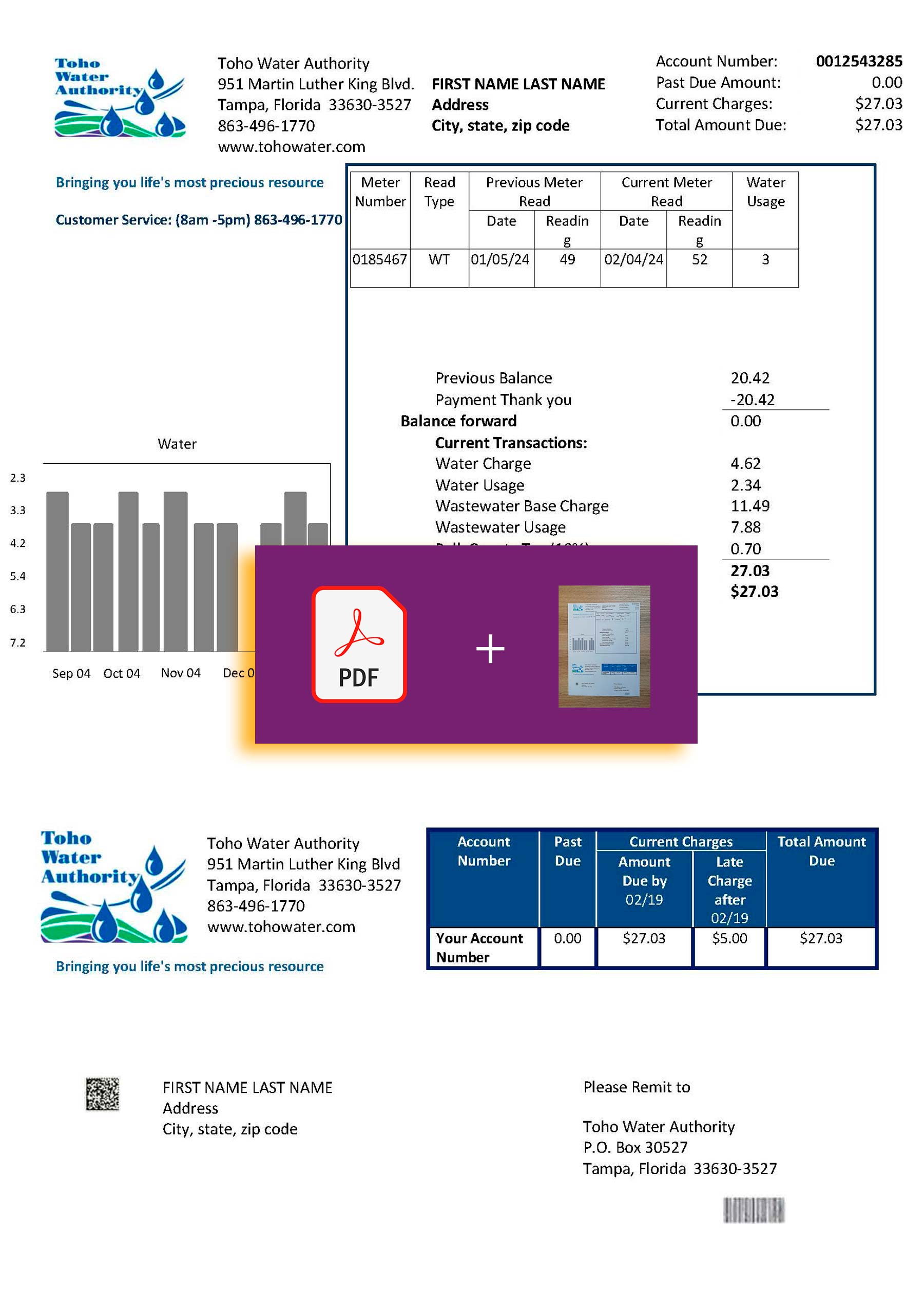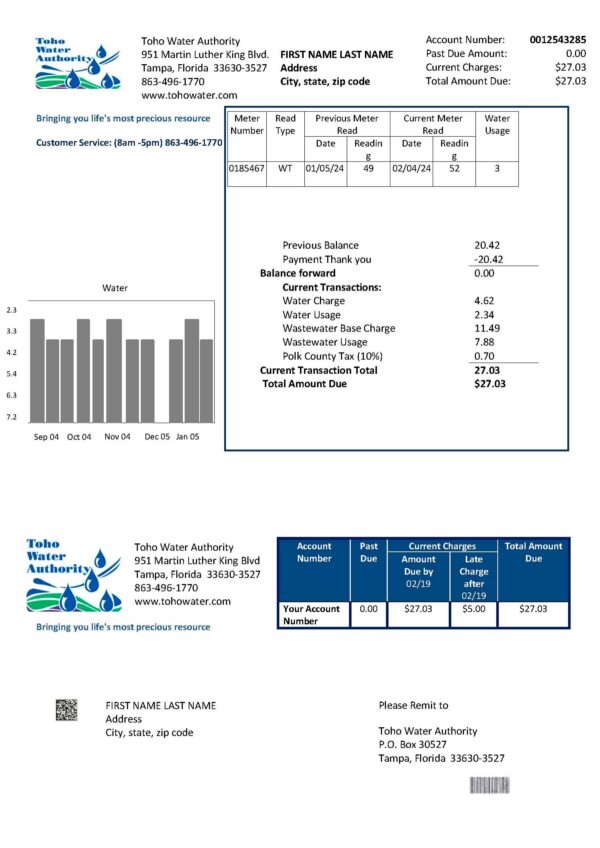 Your download includes PDF and JPEG versions, built in 300-DPI quality for crisp detail. The layout is aligned with Toho Water Authority’s recognizable design and includes editable fields such as customer name, service address, billing cycle, usage lines, and total amounts. You’ll receive free revisions until approval, a secure checkout process, delivery within 24 hours, and 24/7 support for quick updates or assistance.