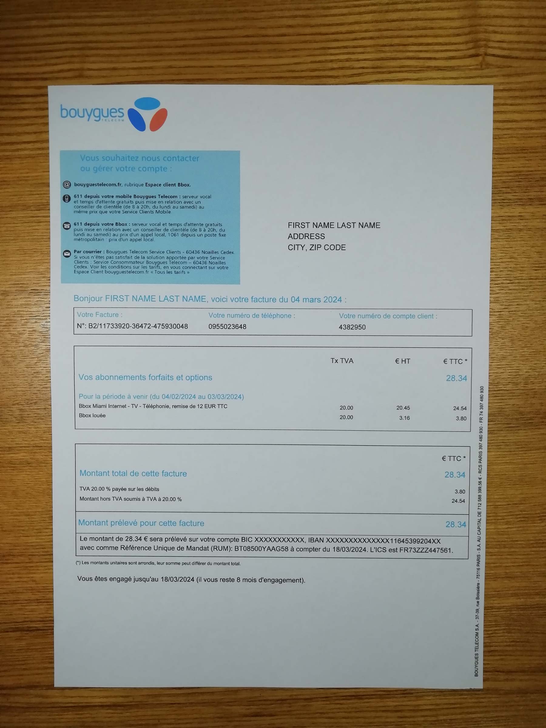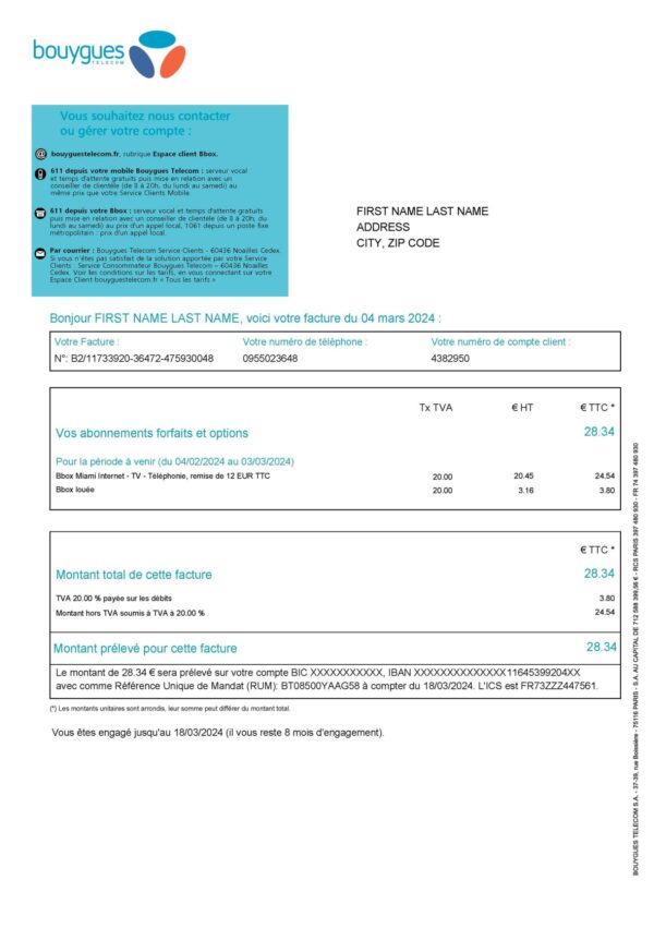 Your download includes JPEG or PDF + JPEG files formatted at 300 DPI. Each layout follows Bouygues Telecom’s French billing design, with editable sections for name, service address, billing period, and totals. You’ll receive your files within 24 hours, with free revisions until fully approved. Secure checkout and continuous 24/7 support ensure a smooth process from purchase to delivery.