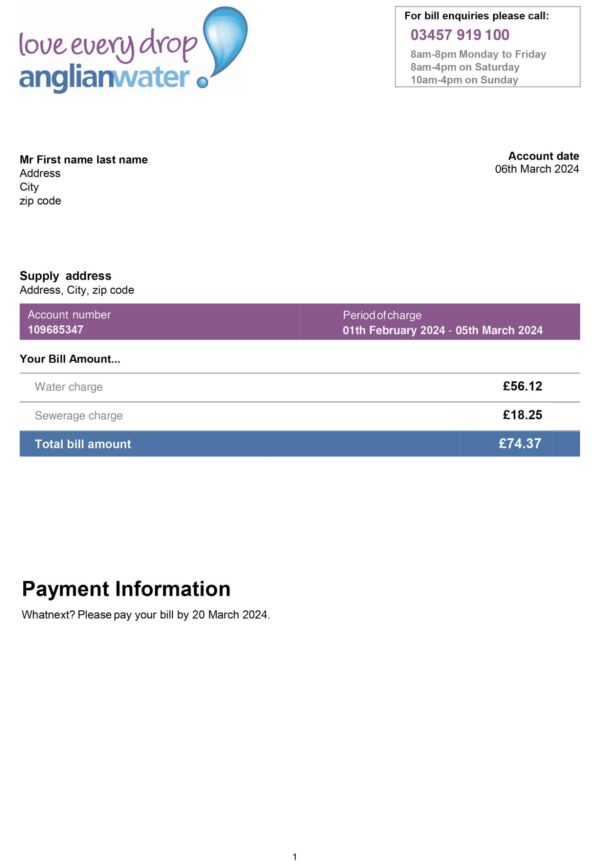 Your download package includes PDF + JPEG files in 300 DPI resolution, following the standard Anglian Water layout used in the UK. Editable fields include customer name, address, billing cycle, usage readings, and balance due. You’ll also receive free revisions until approval, secure payment processing, 24-hour turnaround, and dedicated 24/7 support for a seamless experience.