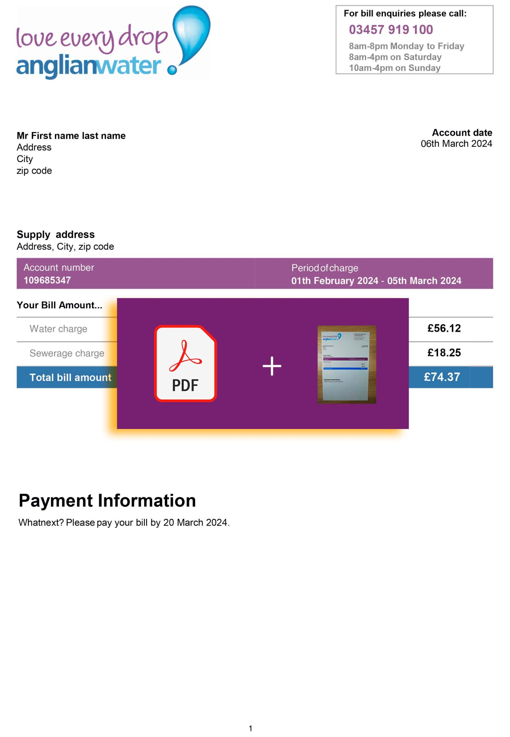 Editable fields include name, service address, billing cycle, consumption data, and totals. The file maintains Anglian Water’s authentic layout and supports Photoshop and standard PDF editors for quick adjustments.
