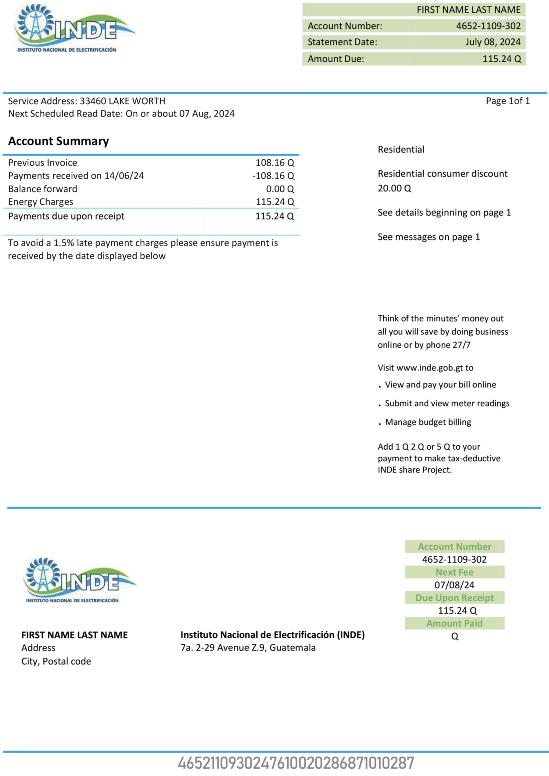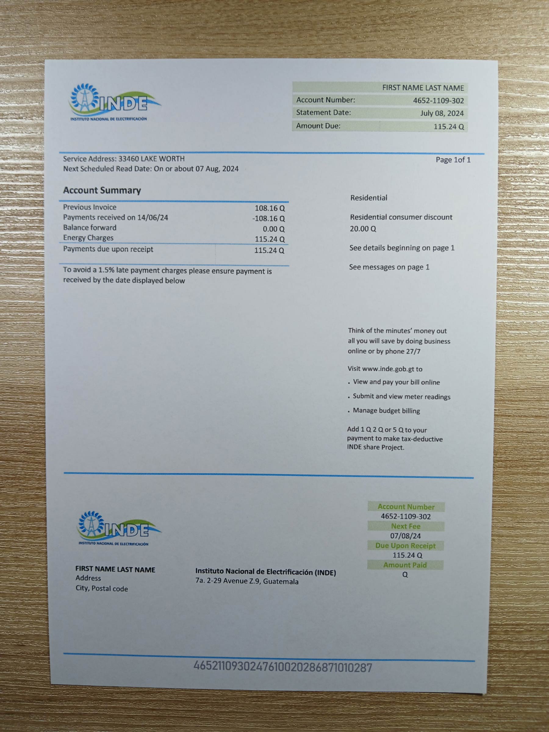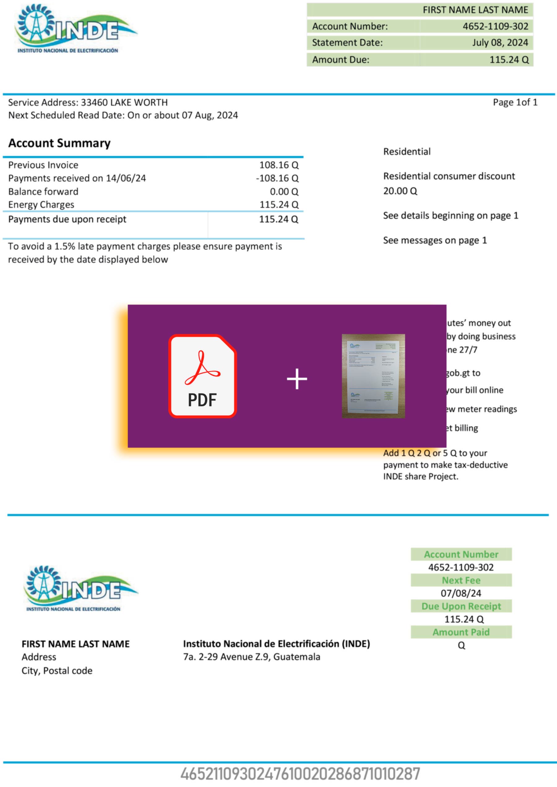 You’ll receive PDF and JPEG versions in 300 DPI clarity. The file accurately reflects INDE’s Guatemalan light bill format and includes editable areas for customer name, address, account number, billing cycle, energy usage, and total amount due. All orders include free revisions until approved, a guaranteed 24-hour turnaround, encrypted checkout, and around-the-clock customer support.