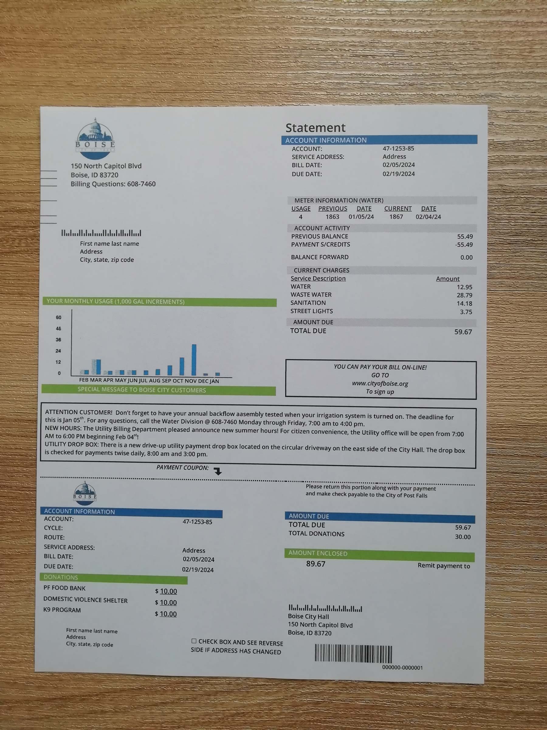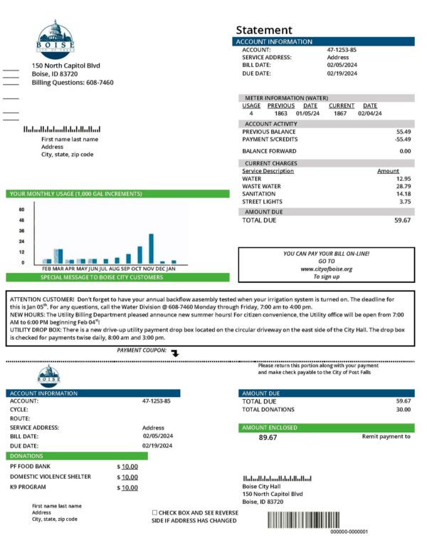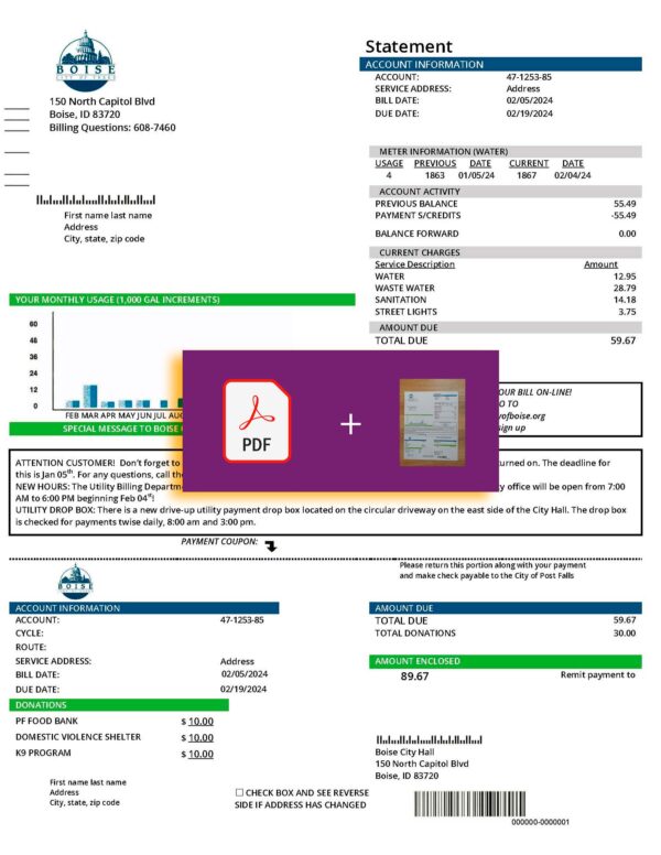 You’ll receive JPEG or PDF + JPEG versions, both designed in sharp 300 DPI resolution and aligned with standard Idaho utility layouts. Editable fields include customer name, address, billing cycle, meter details, and total charges. Every order includes free revisions until approval, a 24-hour turnaround, secure checkout, and round-the-clock customer support to ensure a smooth experience from purchase to delivery.
