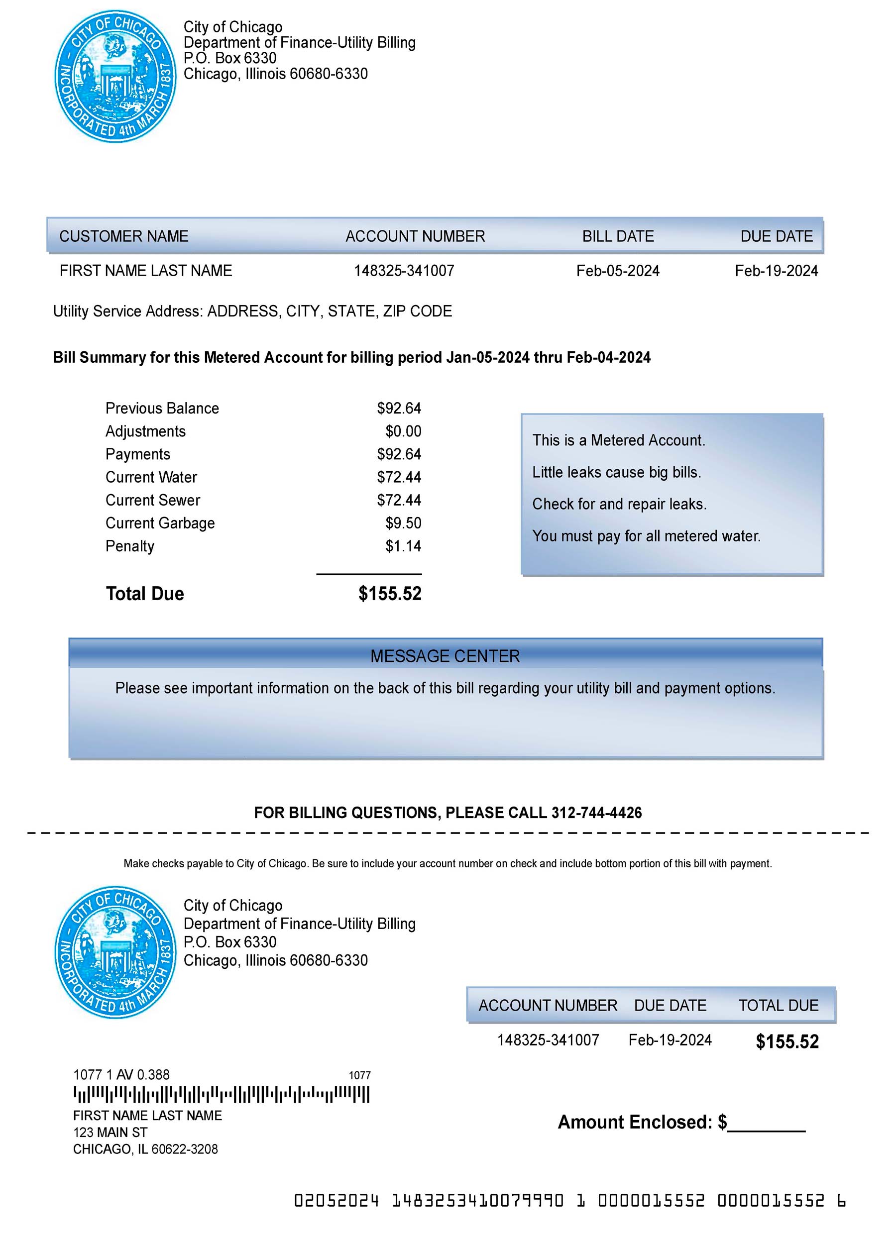 Your download package includes JPEG and PDF versions at 300 DPI, fully aligned with the Chicago Department of Water Management’s visual structure. Editable sections include customer name, service address, billing cycle, water and sewer charges, garbage fees, and total due. Each order includes secure checkout, delivery within 24 hours, free revisions until approval, and 24/7 support for seamless adjustments and updates.