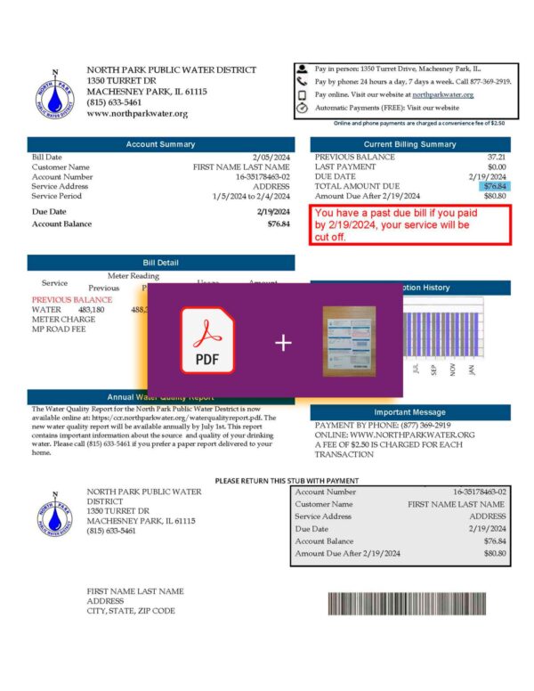 The bill is registered in your name at a real, active North Park Water District service address within our Illinois partner network. You can indicate your preferred billing date range when placing the order to ensure the statement period meets your address verification requirements.