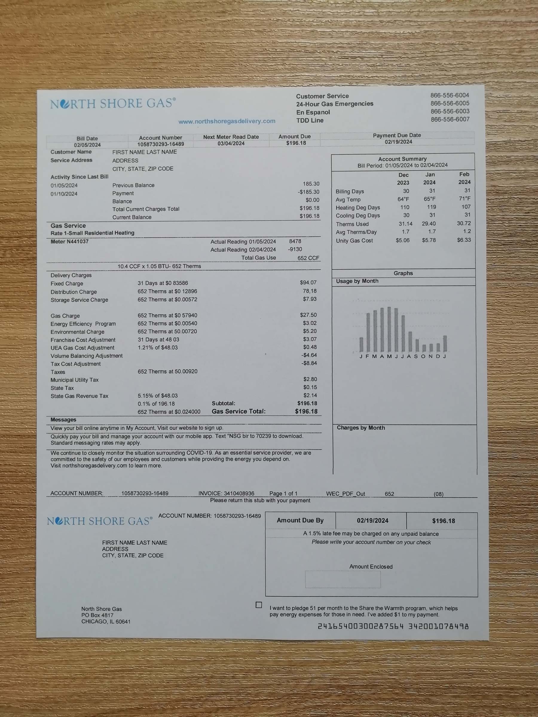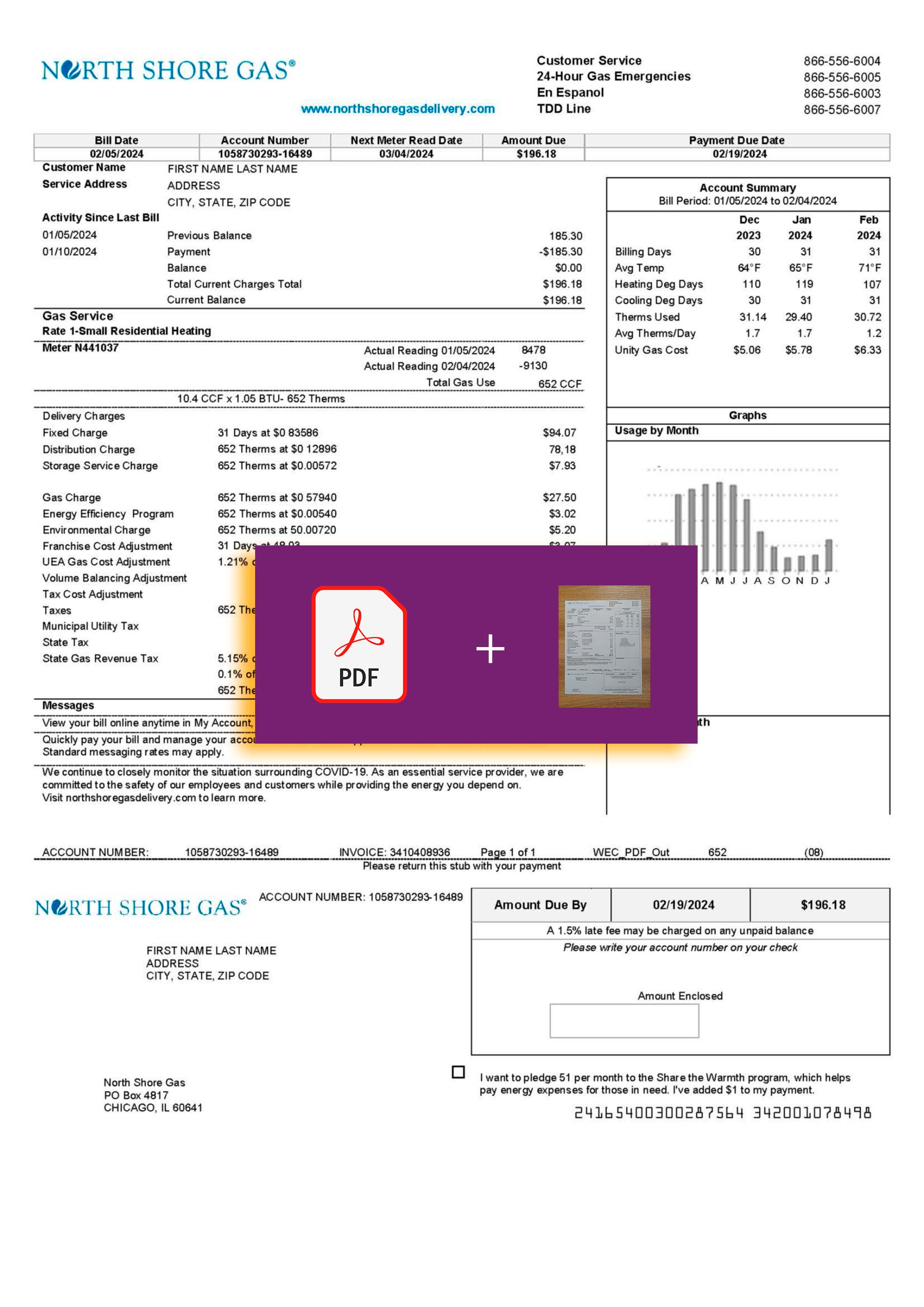 Your order includes JPEG and PDF versions at 300 DPI quality, formatted to match the official North Shore Gas layout for Illinois. Editable elements include the customer name, service address, billing cycle, gas usage, and total charges. Each order comes with free revisions until approval, secure checkout, a guaranteed 24-hour turnaround, and responsive 24/7 support for assistance with layout or data adjustments.