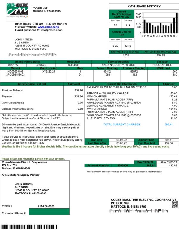 Editable sections include the customer’s name, address, billing period, usage lines, and totals. The layout replicates the original Coles Moultrie design and is fully compatible with popular editing tools like Adobe Photoshop and PDF editors, retaining 300 DPI clarity and print precision.