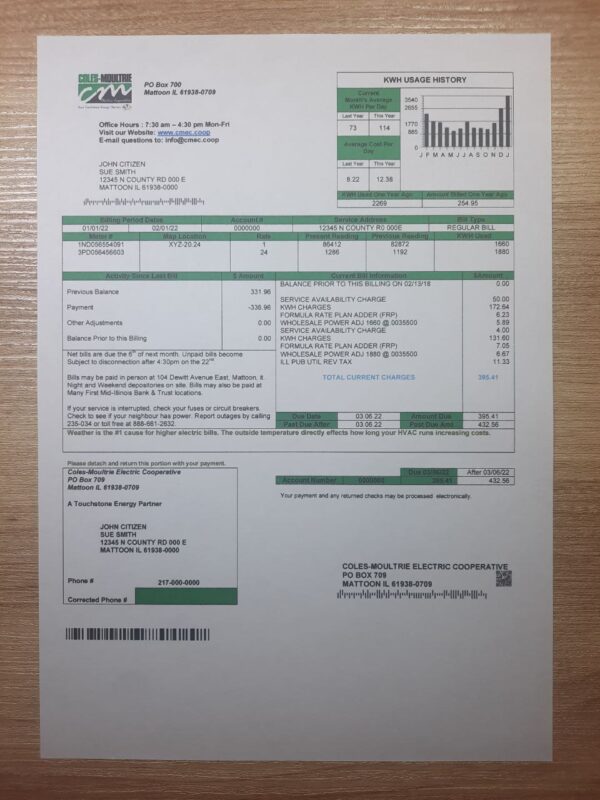 Moving into a new place in Illinois often means your first Coles-Moultrie utility statement is still a billing cycle away when paperwork is already due. You share your details, the team prepares a Coles-Moultrie document in your name, and the finished file is sent to your email as a JPEG or PDF+JPEG depending on your package. Ready within 24 hours, with same-day turnaround on most orders.