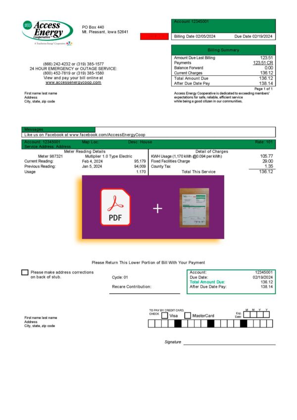 You’ll receive JPEG or PDF + JPEG formats at 300 DPI with editable fields for customer name, service address, billing cycle, and total charges. Every layout follows Access Energy Cooperative’s Iowa design standards. The order includes free revisions until approval, secure checkout with 256-bit SSL encryption, 24-hour turnaround, and dedicated 24/7 customer support to ensure seamless delivery.