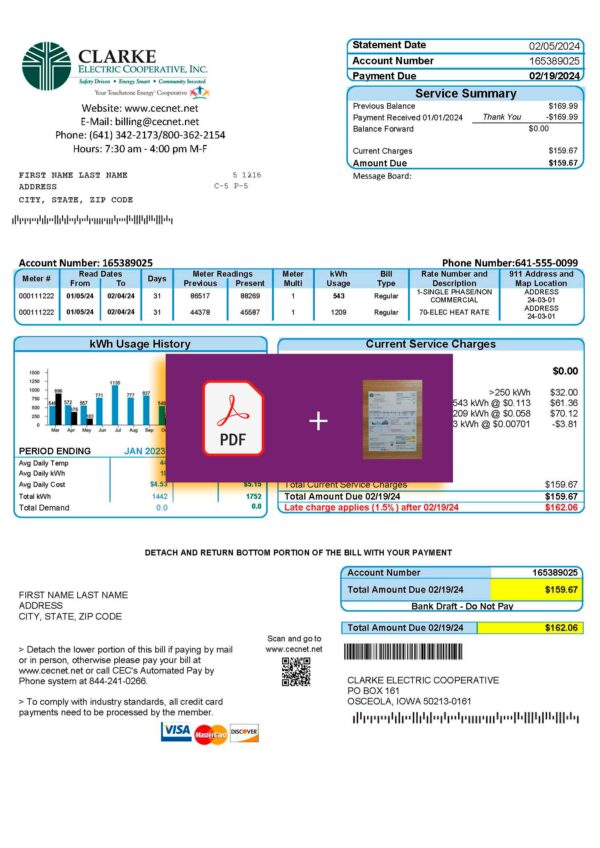 Package includes high-quality PDF and JPEG files (300 DPI) that replicate Clarke Electric’s Iowa layout. You’ll receive editable fields for account name, service address, billing period, and amount due. Every order comes with free revisions until approval, 24-hour turnaround, secure checkout, and 24/7 customer support to ensure a smooth experience from start to finish.