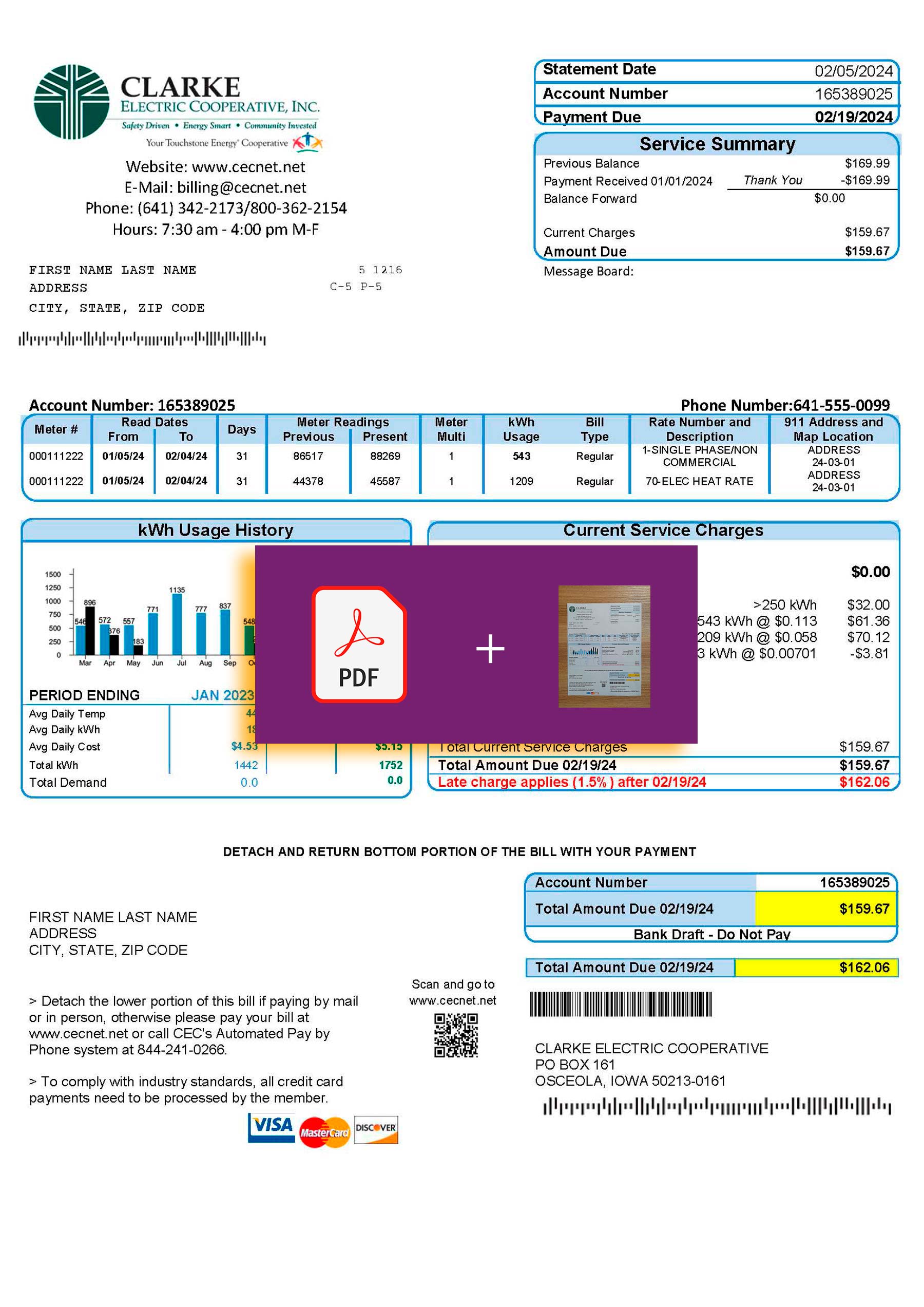 Editable sections include customer name, service address, billing cycle, kWh consumption, and total balance. The layout replicates Clarke Electric’s cooperative bill style and is fully compatible with PDF editors and Adobe Photoshop. Each export is 300 DPI for professional clarity.