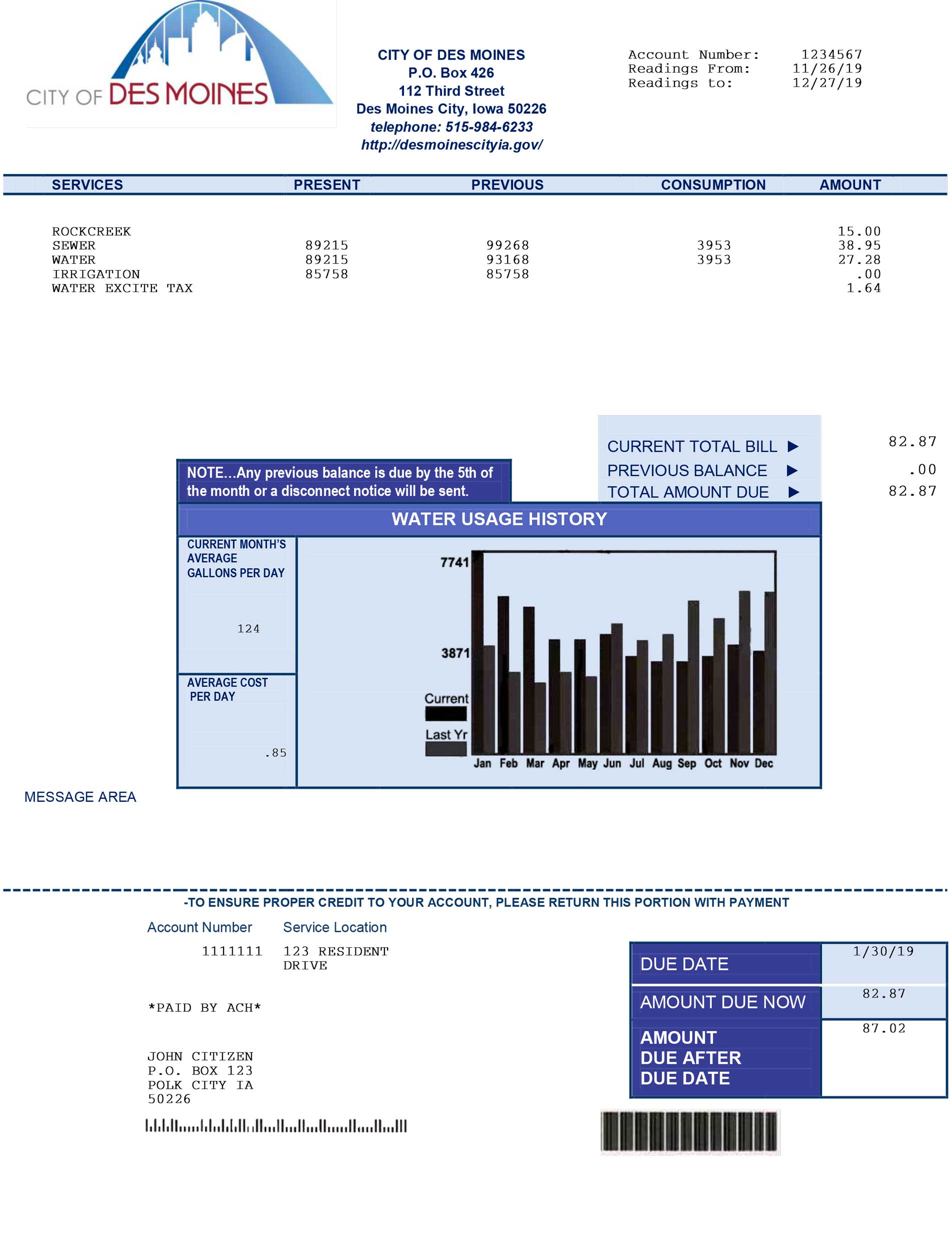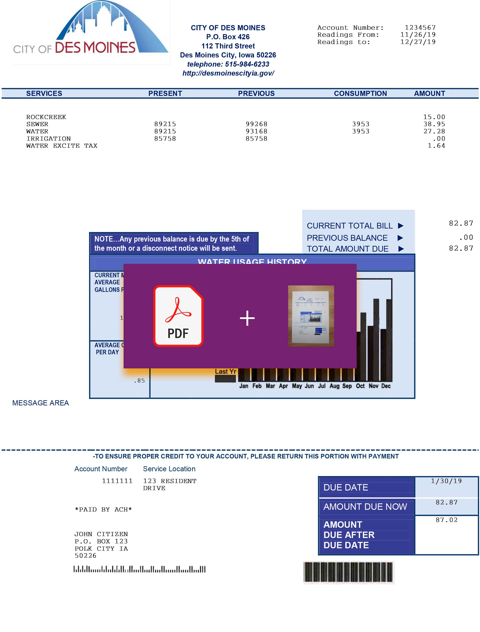 Editable fields include customer name, address, billing cycle, water usage, and totals. The layout preserves a realistic Iowa water statement design and works seamlessly with PDF editors or Photoshop. All exports retain sharp, clear 300 DPI resolution for professional presentation.