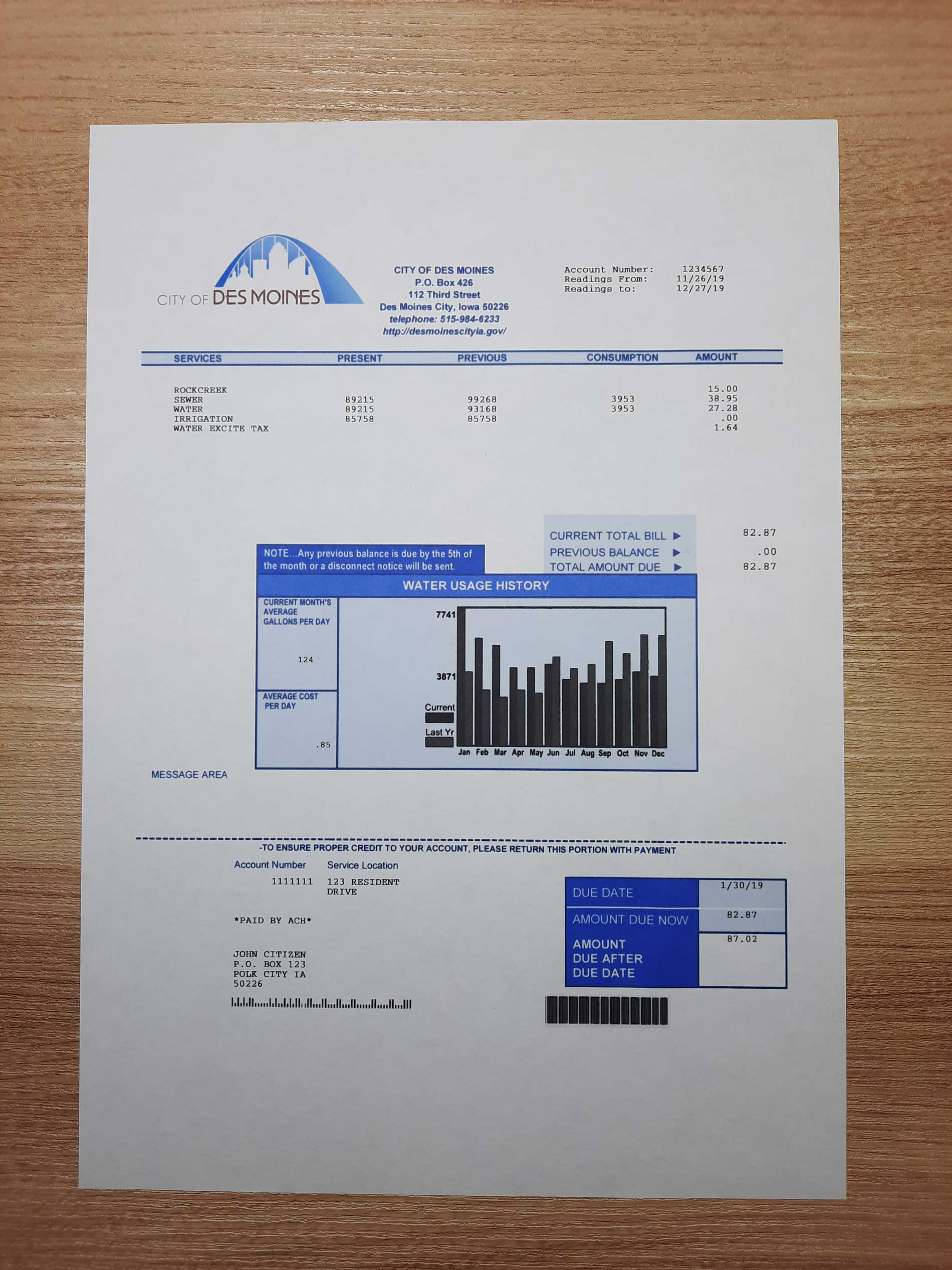 Your order includes PDF and JPEG versions in 300 DPI resolution. The layout follows the standard Iowa Water format, featuring editable sections for customer name, address, billing period, usage summary, and balance due. You’ll receive free revisions until approved, delivery within 24 hours, secure checkout, and continuous 24/7 support. Each file maintains professional realism for documentation, KYC, or UI/UX visualization projects.