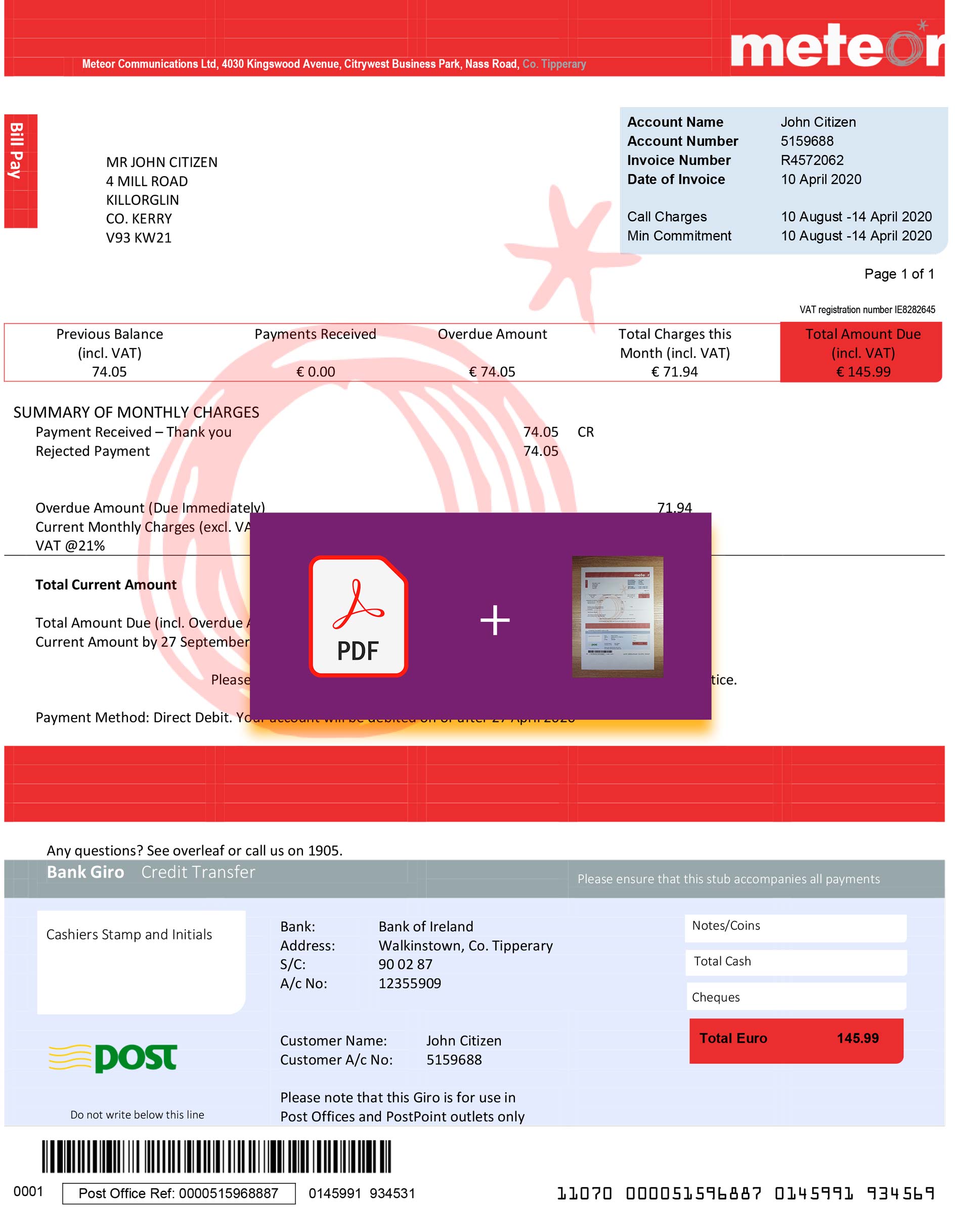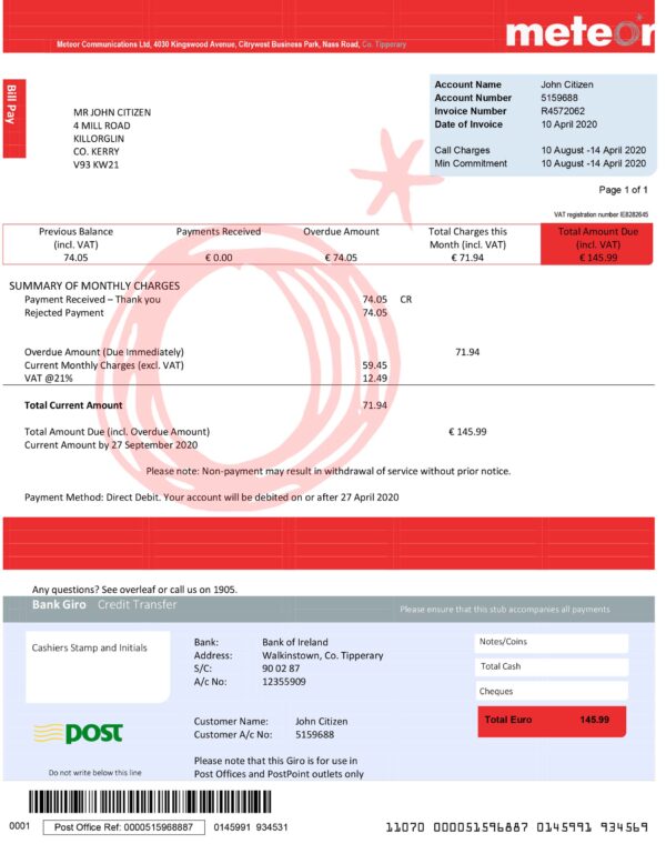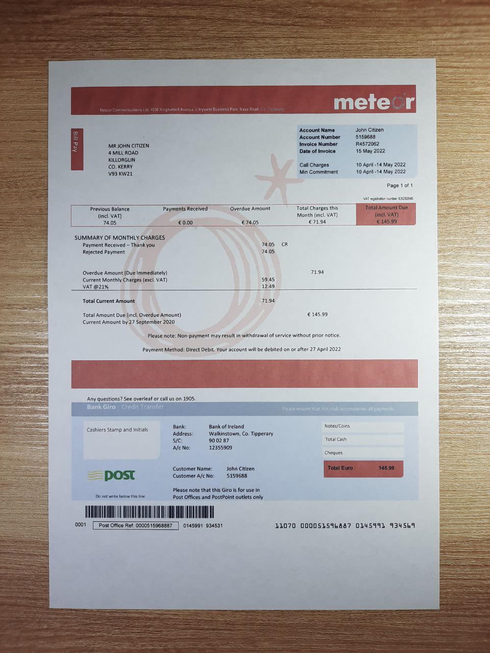 Explore the Ireland Meteor phone bill together with the Electric Ireland statement and the Domestic Water Ireland bill, both offering realistic templates ideal for digital simulations and verification demos.