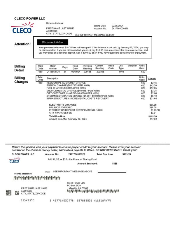 Your order includes JPEG or PDF + JPEG formats in high-resolution (300 DPI). The layout is aligned with Cleco Power’s Louisiana format, including editable sections for customer name, address, billing period, energy usage, and payment details. Enjoy free revisions until approval, guaranteed 24-hour turnaround, secure checkout, and full 24/7 support for a smooth, professional experience.