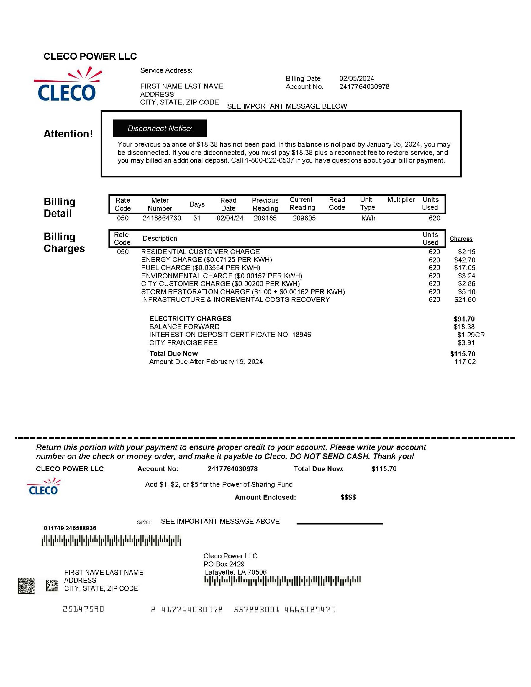 Editable areas include customer information, address, billing cycle, usage summary, and totals. The design preserves the structure of the Cleco Power layout and is compatible with standard PDF editors and Photoshop. All exports are delivered at 300 DPI to maintain crisp, realistic quality.