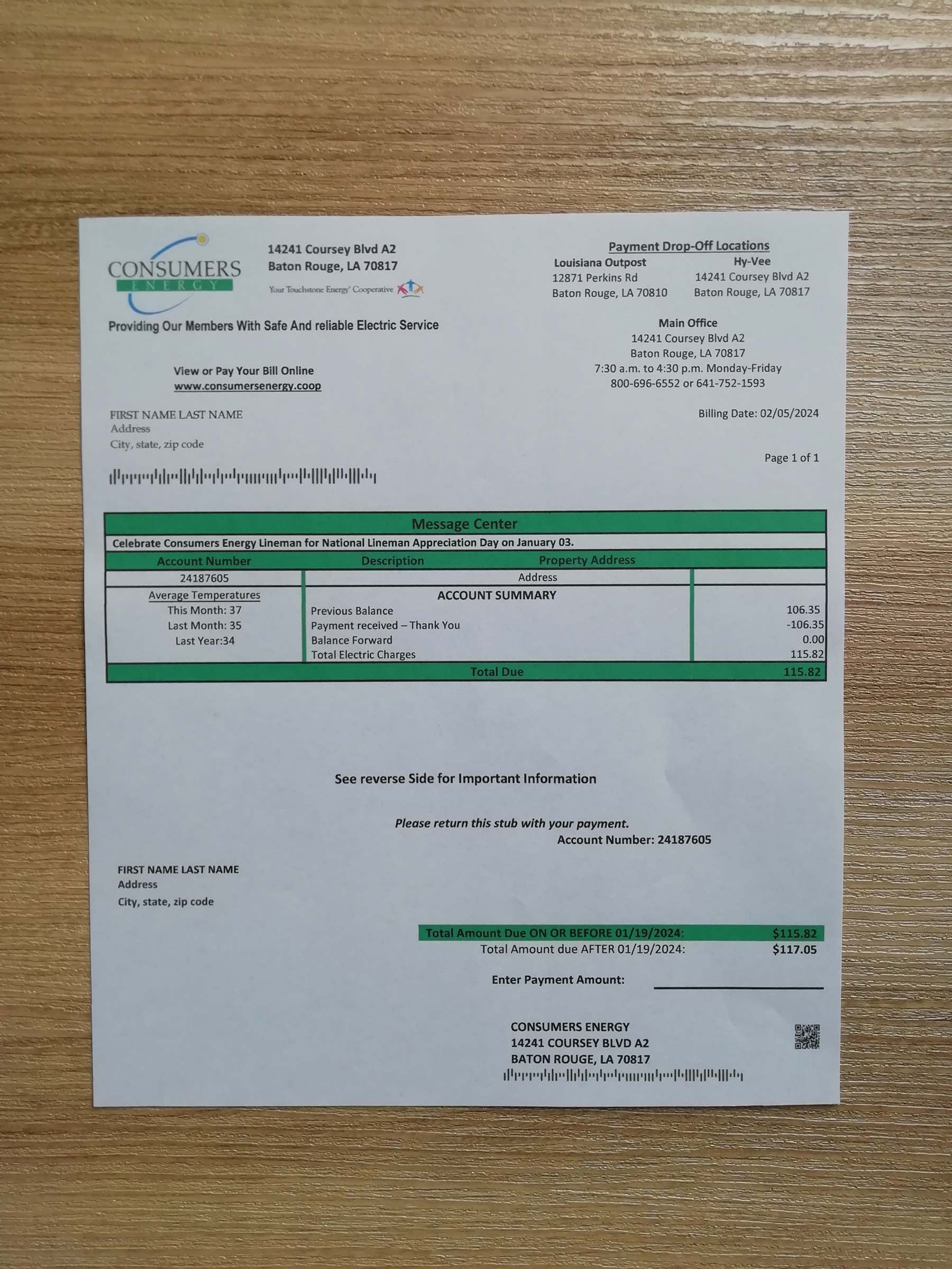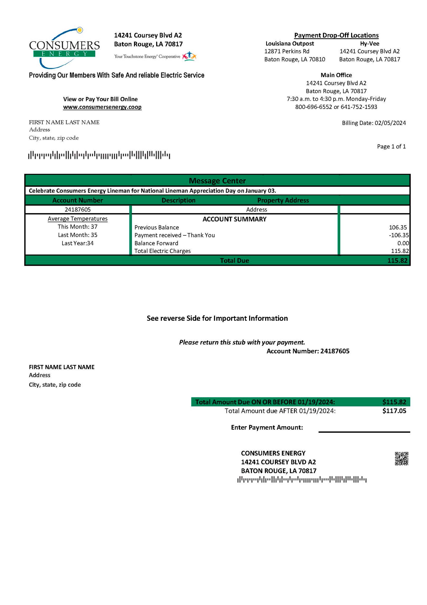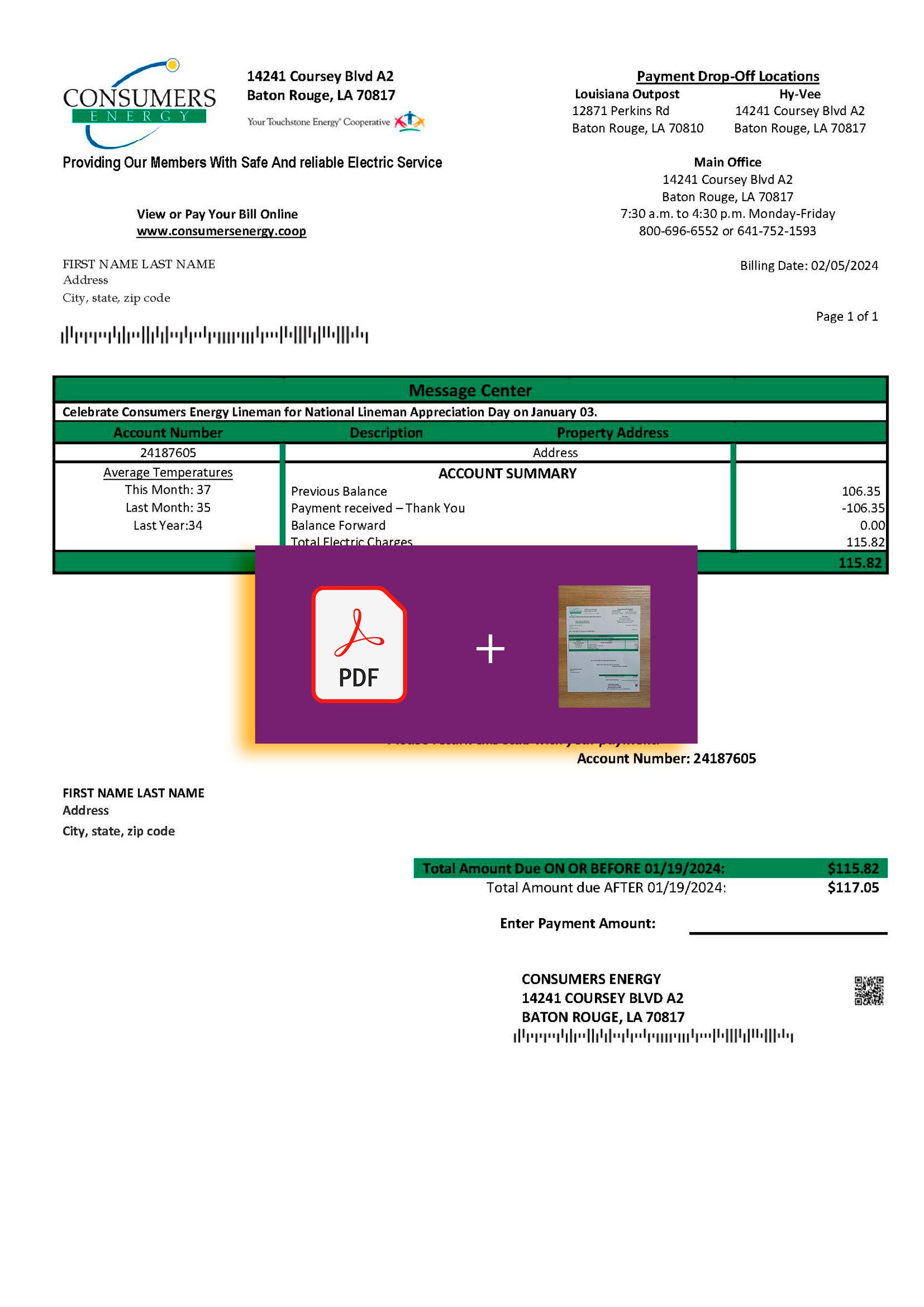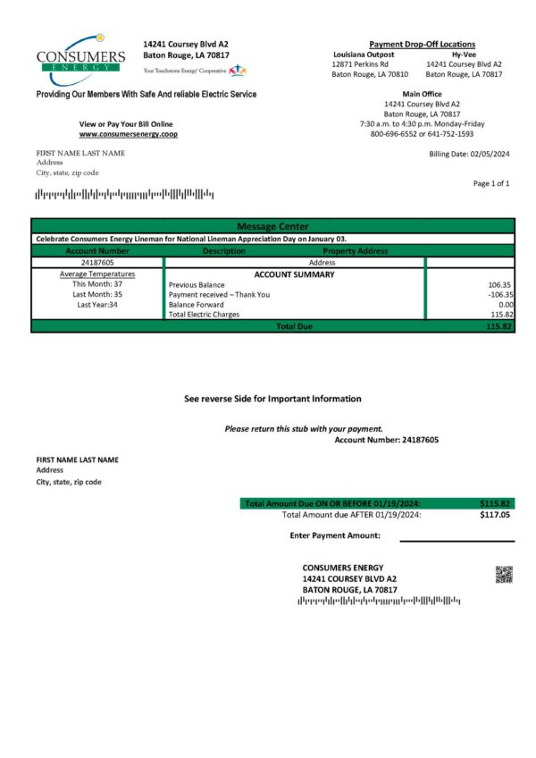 The Louisiana Consumers Energy template provides a lifelike bill design adapted for address verification and user interface previews. To explore more regional utilities, check out the Constellation Energy Michigan version or the Xcel Energy Michigan template for consistent formatting and realism.