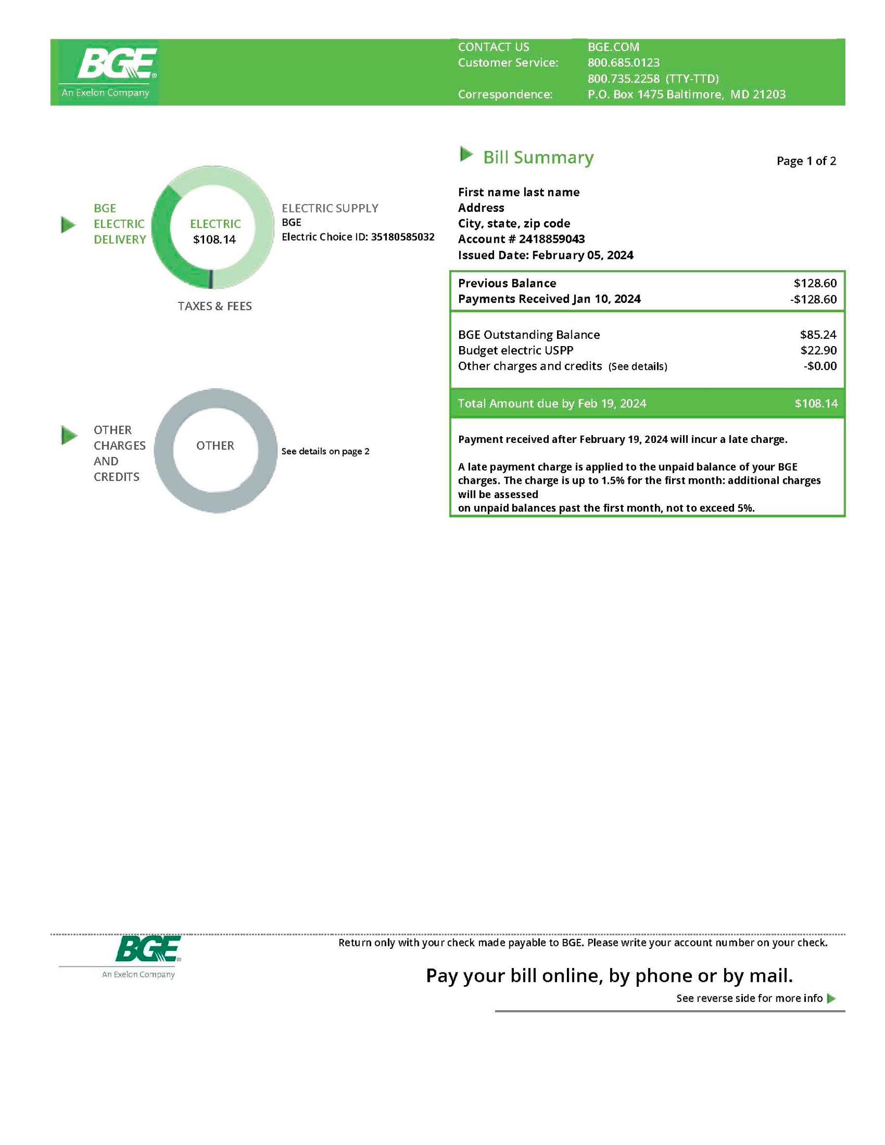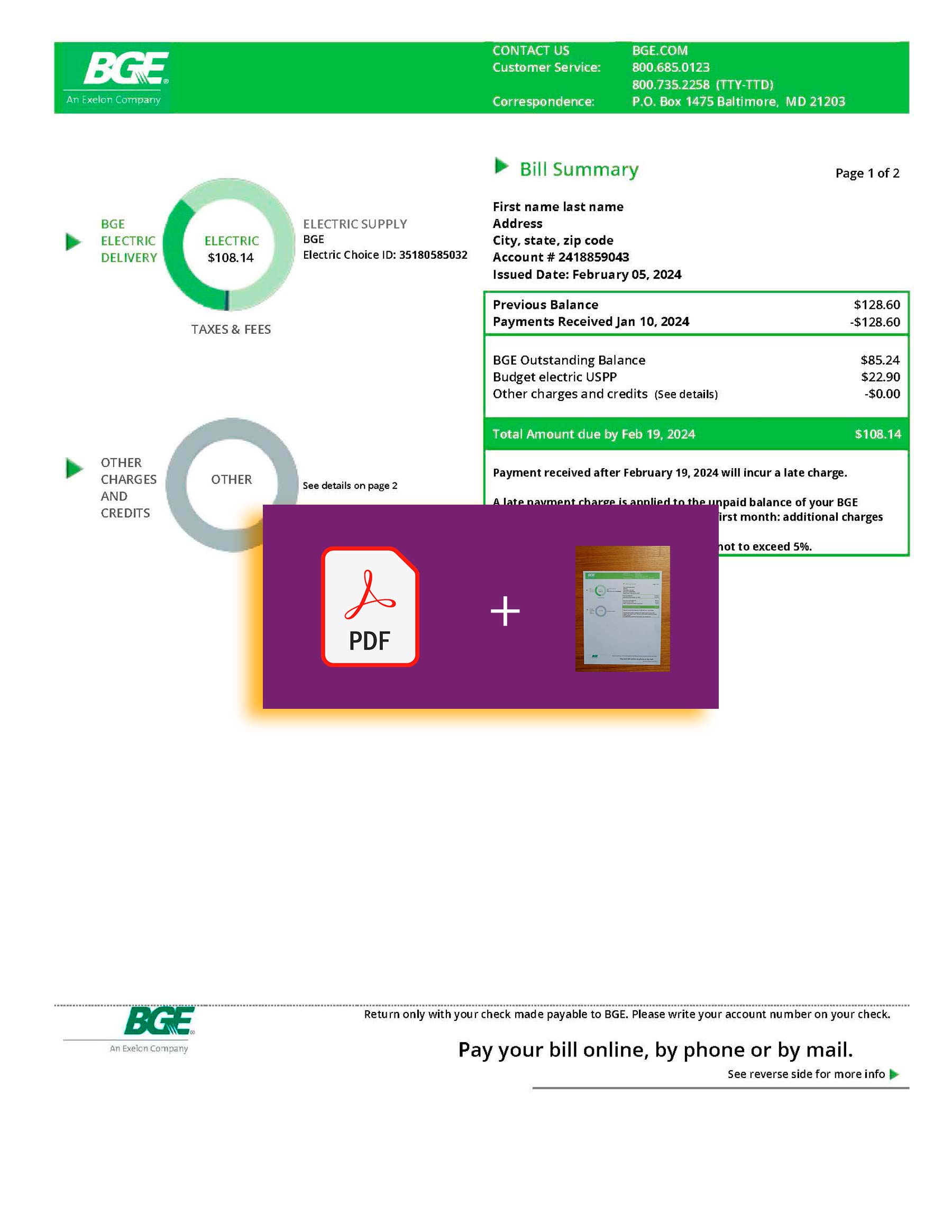 Editable components include customer name, address, billing cycle, usage readings, and totals. The layout is preserved to match BGE’s authentic design and can be modified using standard PDF editors or Adobe Photoshop at full 300-DPI quality.