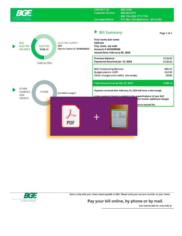 Your package includes PDF + JPEG files (300 DPI) formatted to replicate BGE’s Maryland layout. Each document contains editable sections for name, address, billing dates, usage lines, and totals. You’ll receive free revisions until the final version is approved, secure checkout, 24/7 assistance, and guaranteed delivery within 24 hours. The design remains faithful to the provider’s original bill layout for clarity and accuracy.
