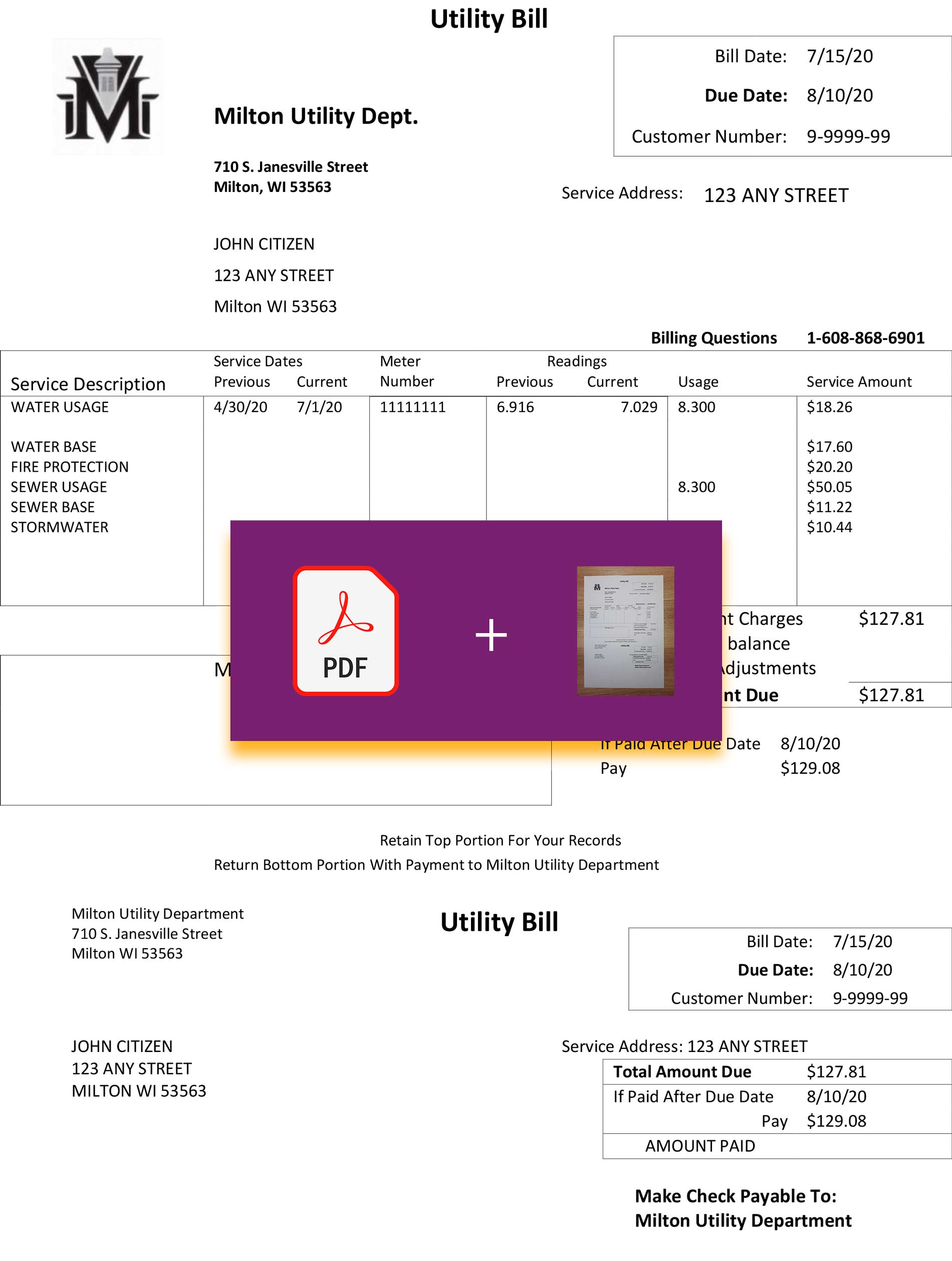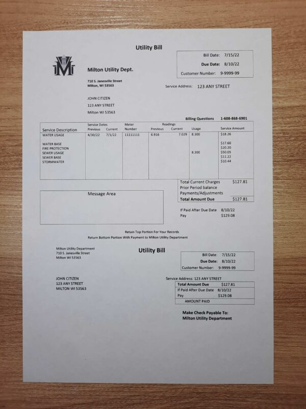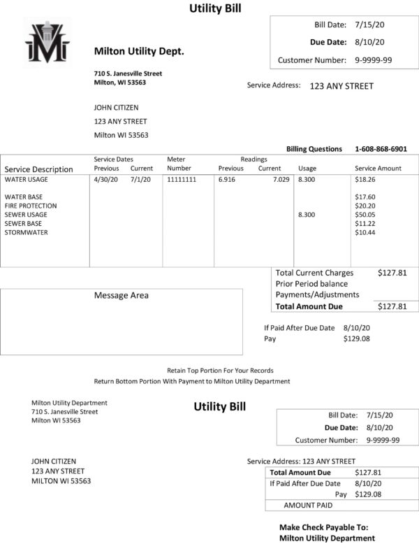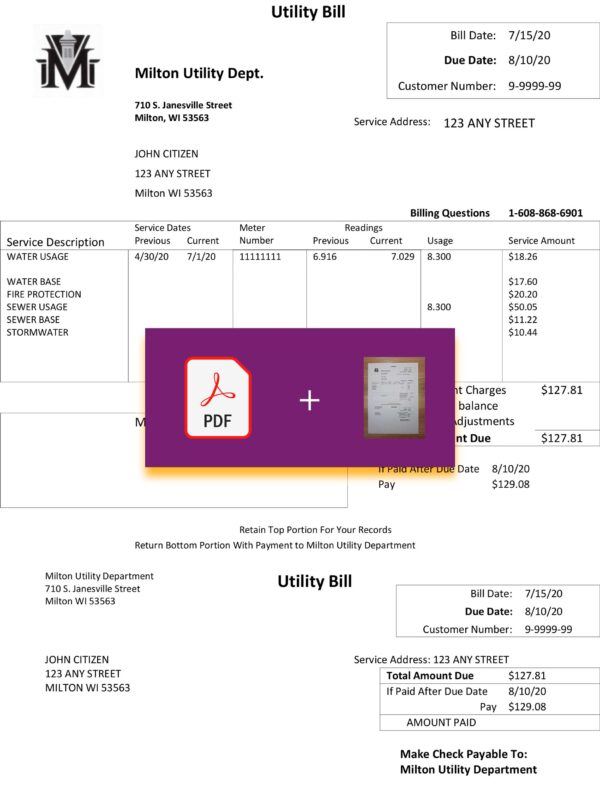 Editable elements include customer name, address, billing cycle, water and electricity usage, and total due amounts. The layout accurately reflects the Milton Utility Department’s structure and is compatible with PDF editors and Adobe Photoshop, preserving 300 DPI print quality.
