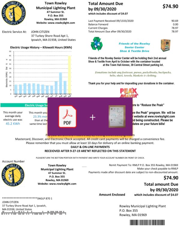 You’ll receive high-quality PDF and JPEG files, formatted to match the authentic Rowley Municipal Lighting Plant layout for Massachusetts. Each file includes editable sections—customer name, address, billing cycle, usage, and totals—ensuring accurate customization. Free revisions are available until approval, and delivery occurs within 24 hours. Every order includes secure checkout and round-the-clock support for smooth project handling.