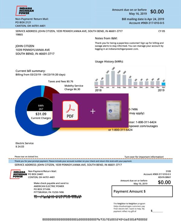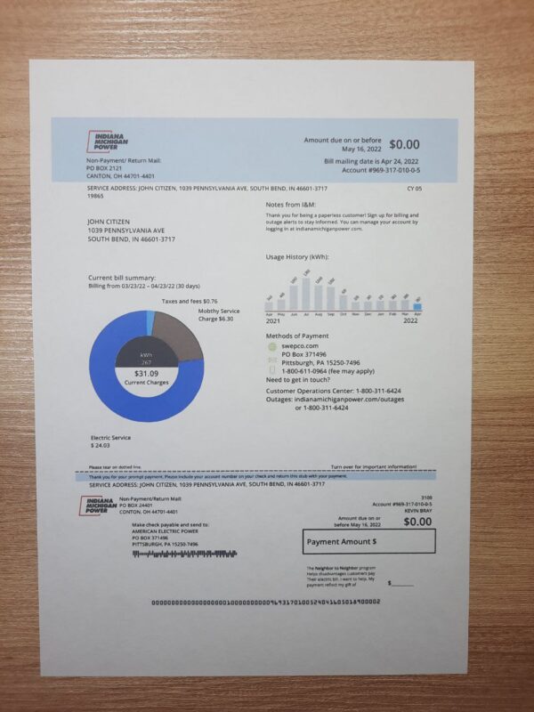 The package includes JPEG or PDF + JPEG files in sharp 300 DPI resolution. The design matches the authentic format of AEP electricity bills issued in Michigan. Editable fields include customer name, account number, address, meter readings, usage history, billing period, and payment summary. You’ll also receive free revisions until approval, a guaranteed 24-hour turnaround, secure checkout, and 24/7 support for seamless assistance throughout your order.