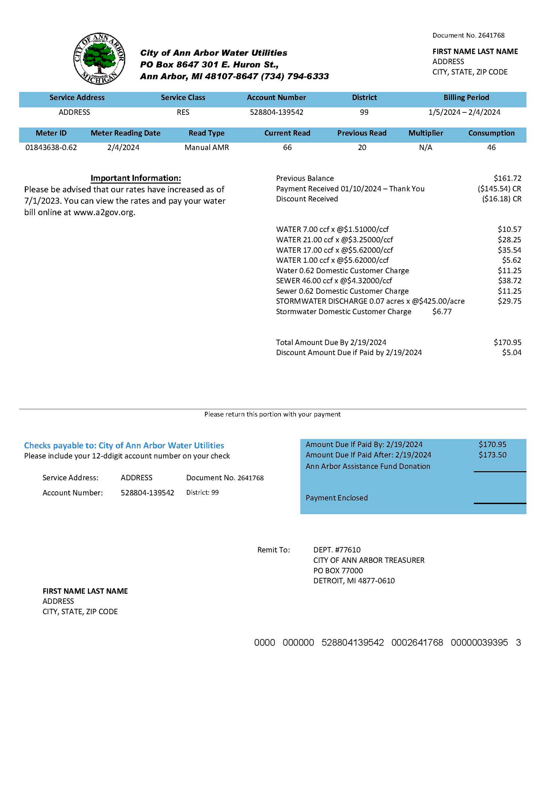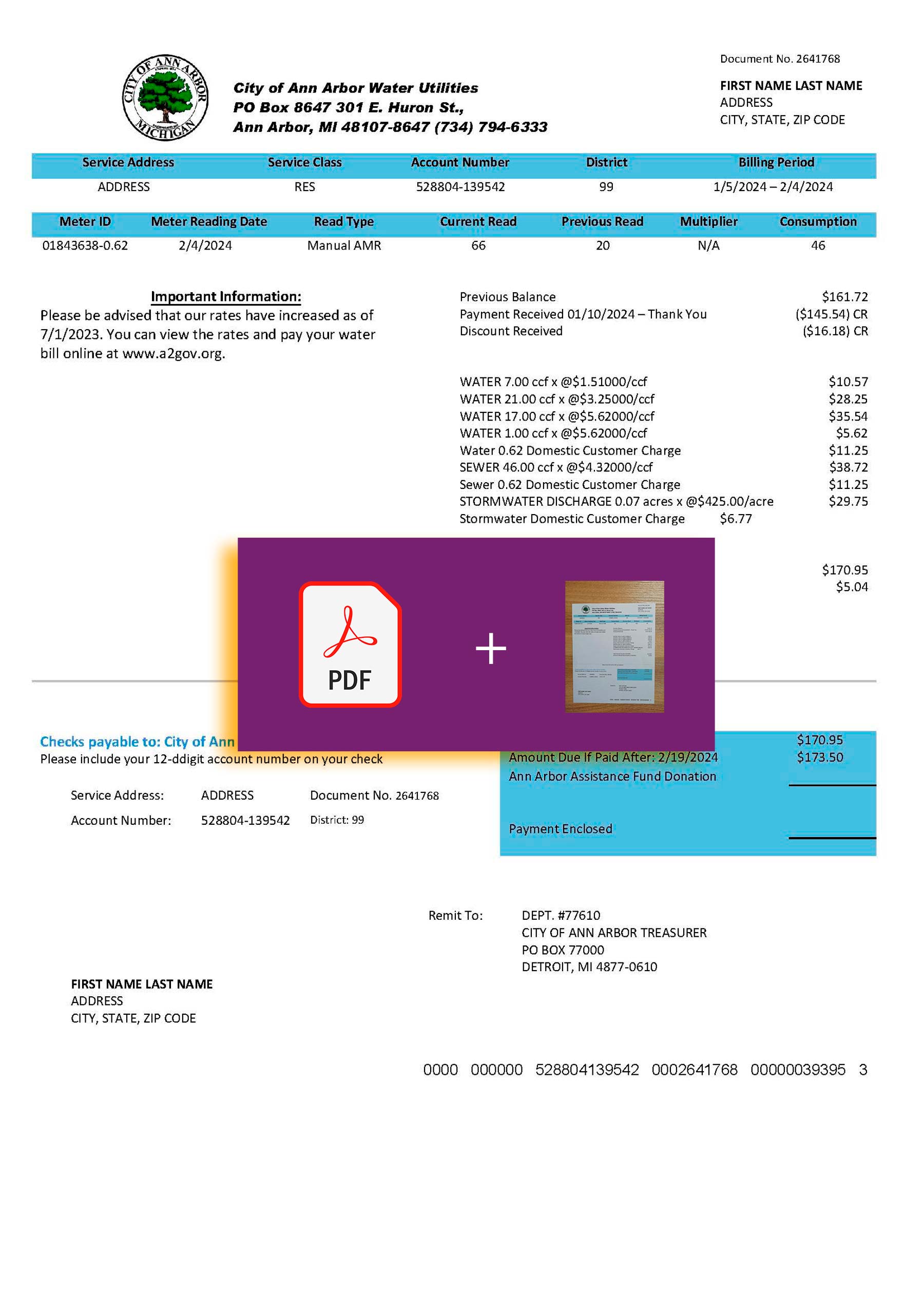 Your download includes JPEG or PDF + JPEG versions, all rendered in crystal-clear 300 DPI. The structure accurately follows the official Ann Arbor Water layout for Michigan. Editable sections include customer name, meter readings, billing period, and payment details. You’ll also receive free revisions until approval, guaranteed 24-hour turnaround, secure checkout, and full 24/7 customer support for a smooth experience from order to delivery.