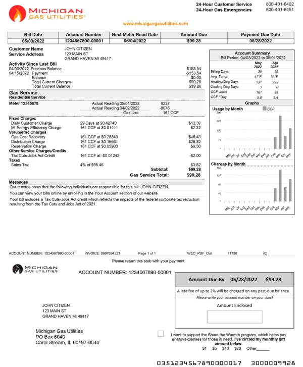 Your purchase includes JPEG or PDF + JPEG versions at professional 300 DPI quality. The layout mirrors the official Michigan Gas Utilities design, retaining authentic billing elements while allowing editable sections such as customer information, billing period, gas consumption, and totals. Each order includes free revisions until approved, delivery within 24 hours, secure payment processing, and 24/7 customer support for a reliable experience from start to finish.