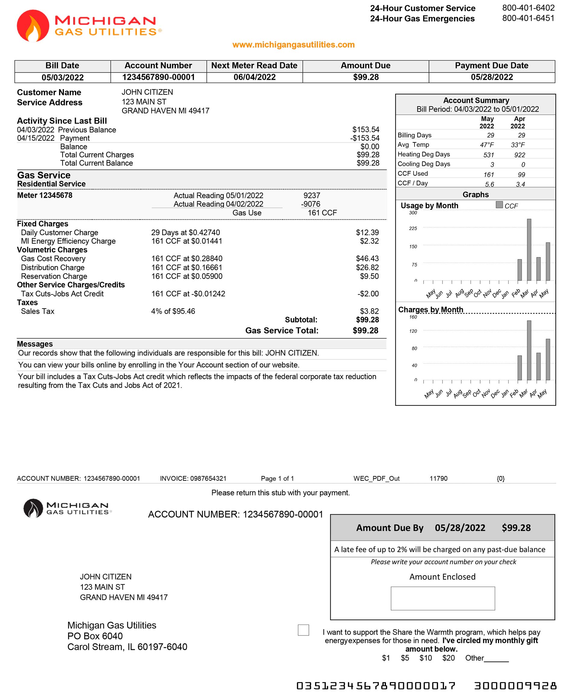 The Michigan Gas Utilities template is a well-crafted editable design suited for testing, verification, or digital UX simulations. For similar resources, check out the DTE Michigan electric template or the Verizon bill layout to compare realistic statement visuals.