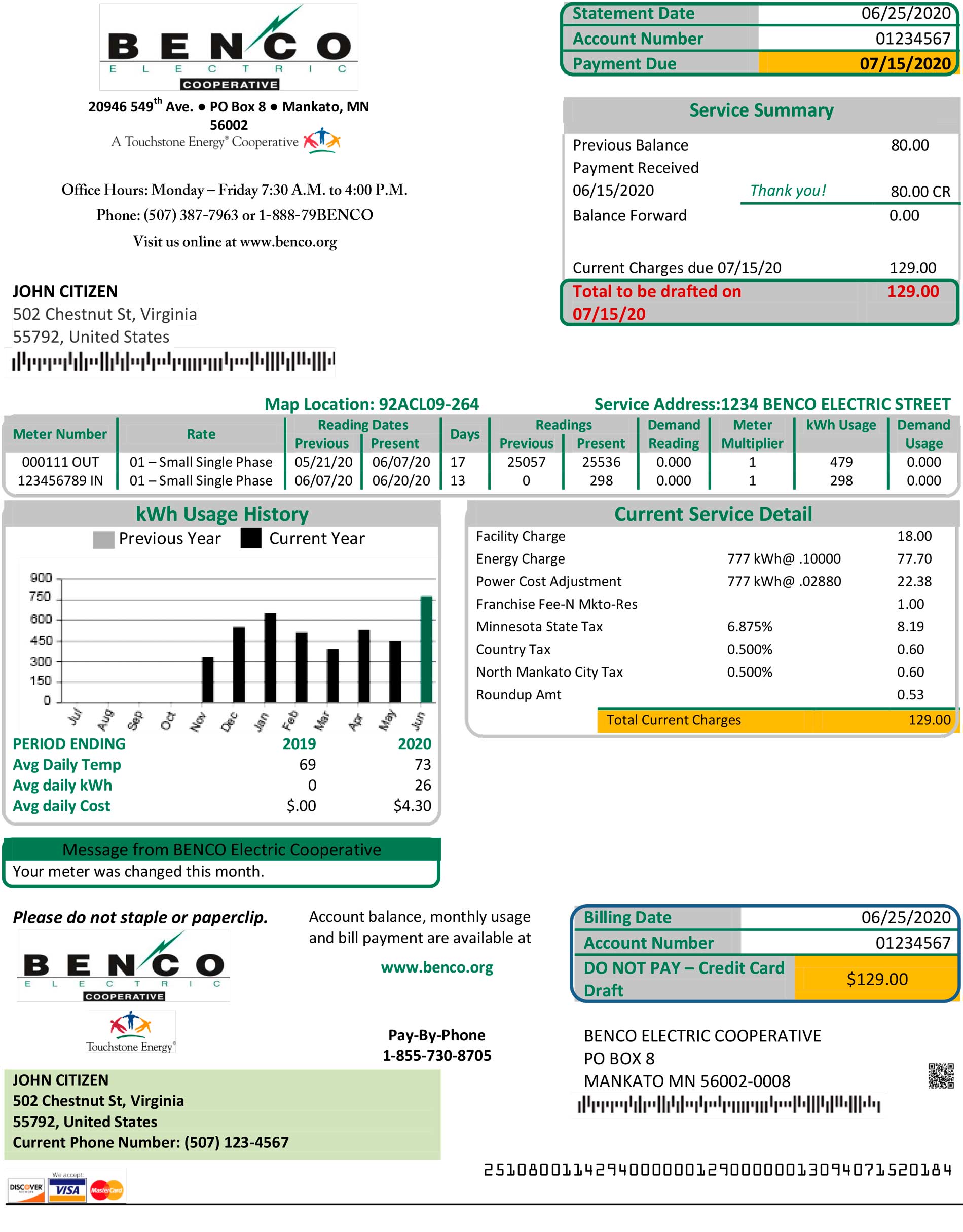 The Benco Electric Minnesota bill template delivers a professional design with editable details suitable for proof-of-address verification. For similar options, check out the Xcel Energy Minnesota layout or the Verizon statement design for realistic alternatives.