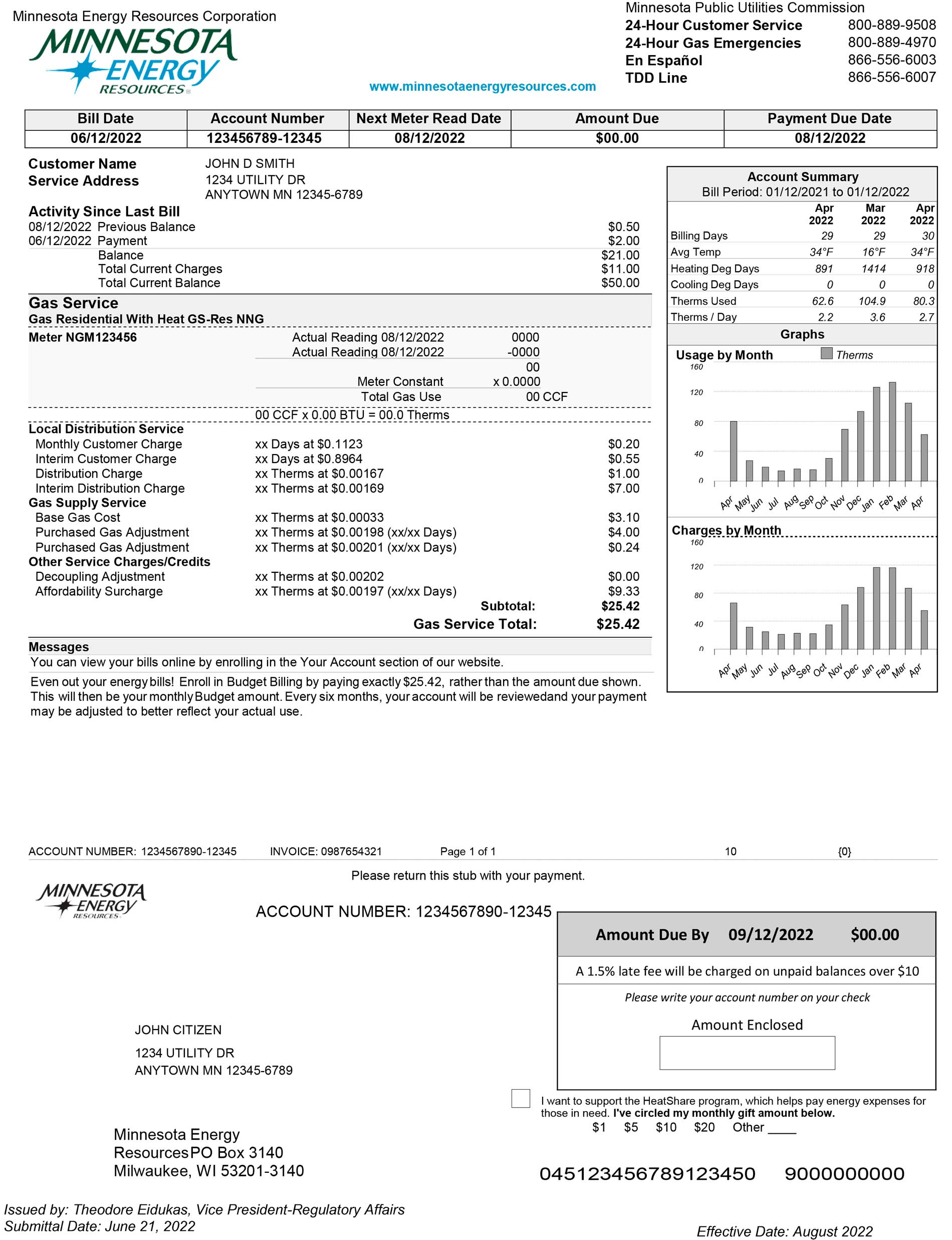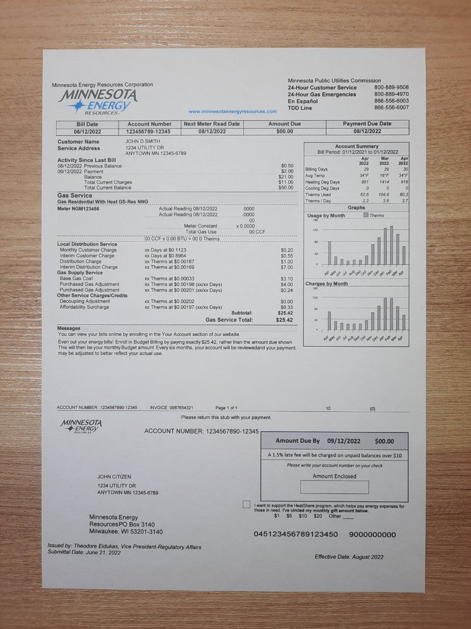 Each order includes JPEG or PDF + JPEG formats, optimized at 300 DPI for sharp and clear print or digital use. The layout stays true to Minnesota Energy Resources’ structure, ensuring authentic placement of billing details. Editable sections include customer data, service address, billing dates, usage metrics, and payment totals. You also receive free revisions until approval, 24-hour turnaround, secure checkout, and 24/7 customer support.