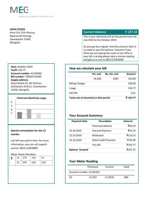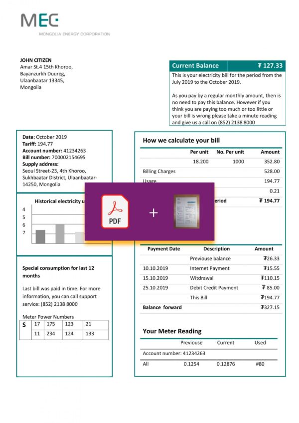You will receive your file in JPEG or PDF + JPEG format, perfectly optimized for digital or print use. Each document follows a clean utility bill layout inspired by Mongolia’s formatting standards. Editable fields include customer information, billing date, address, and total amounts due. Enjoy free revisions until approval, a 24-hour turnaround, and secure checkout with 24/7 support for a seamless experience.