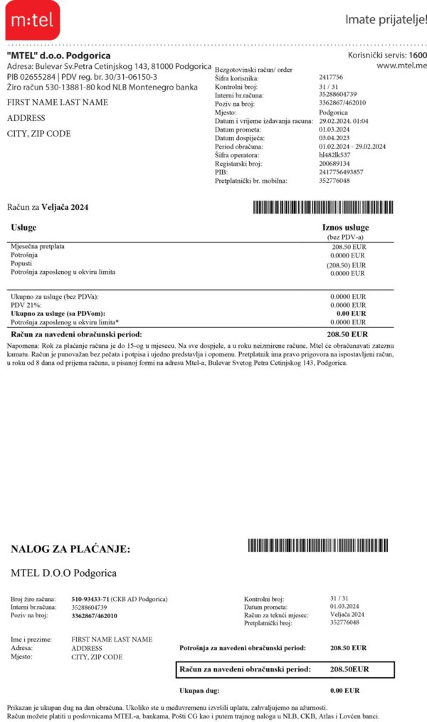 This editable Montenegro utility bill template provides a professional PDF layout modeled after real billing statements used in the region. Designed for realistic documentation and proof-of-address (POA) simulations, it offers a 300 DPI print-ready format that ensures high clarity and visual precision. Perfect for developers, designers, compliance teams, and businesses needing accurate statement visuals for KYC or demo environments, this Done-For-You template streamlines the process — you provide the details, and we handle the rest.