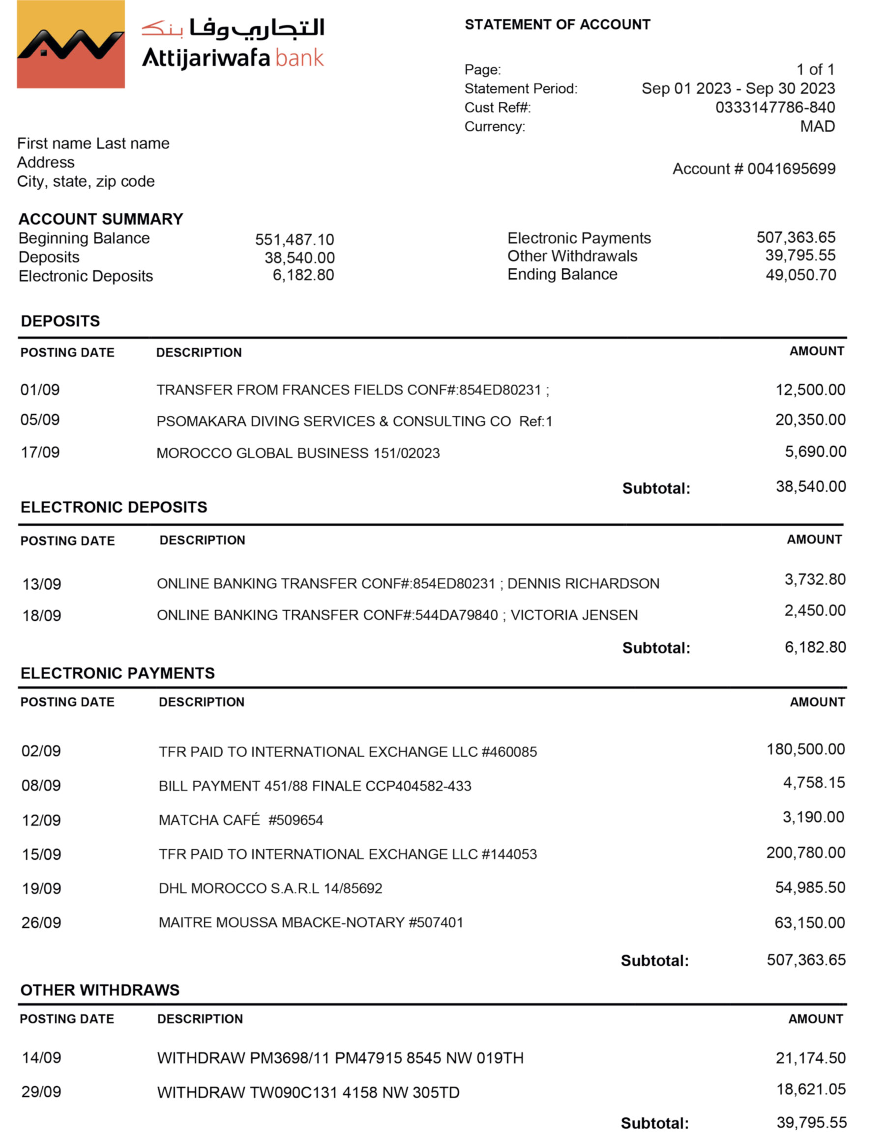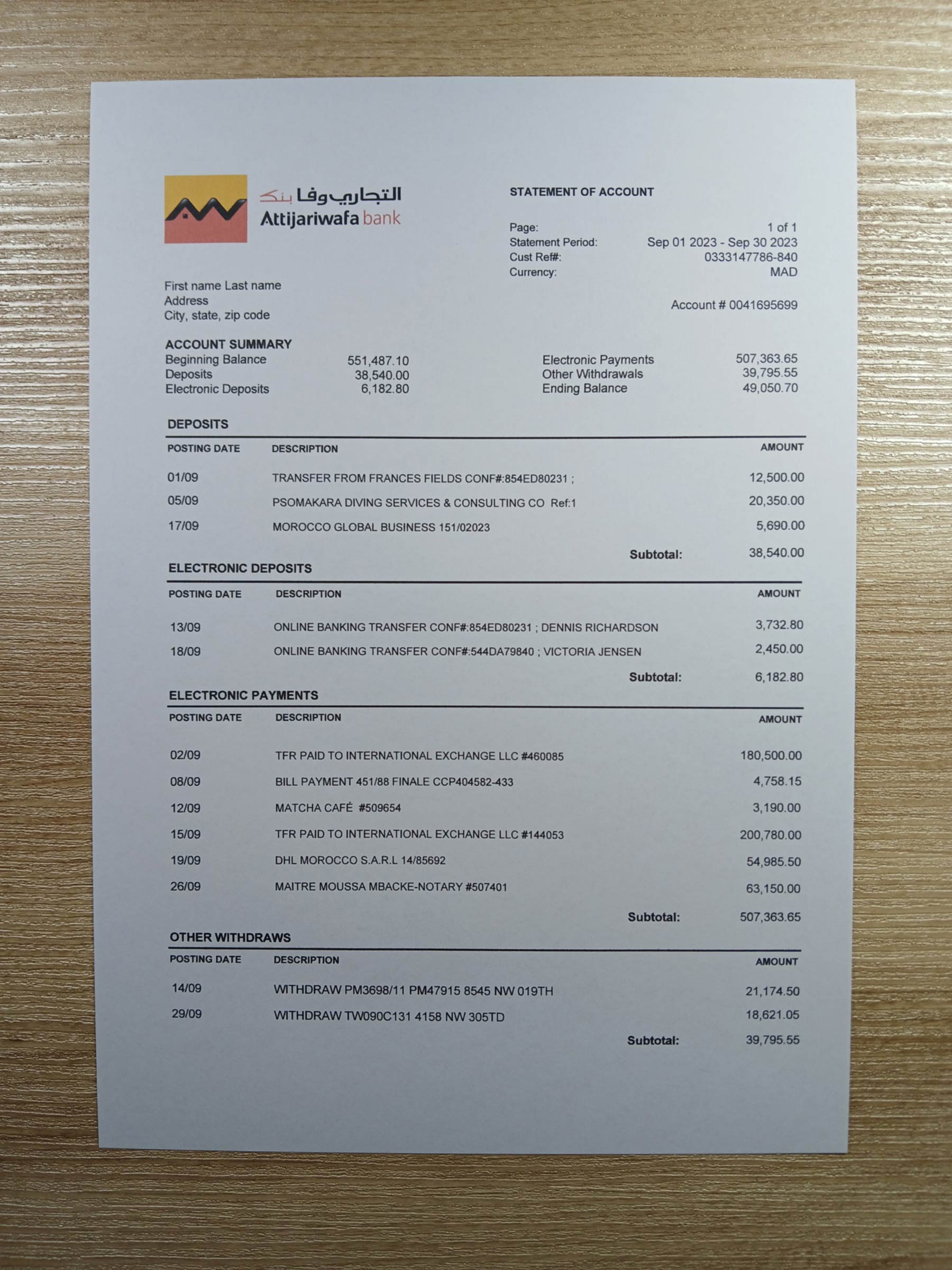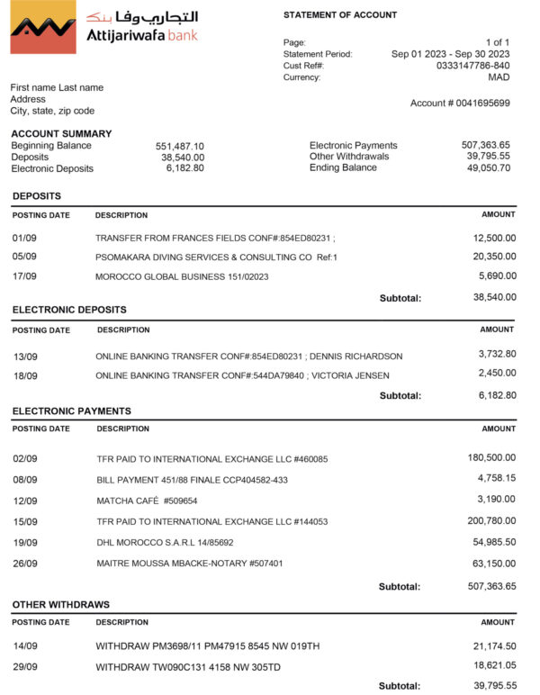 The “Create an Electric Bill Online – Morocco Attijariwafa Bank Statement Template” is a professionally crafted, editable utility bill layout that mirrors the structure of Moroccan electric statements. Built at 300 DPI, this high-resolution file is available in both PDF and JPEG formats, providing clear and realistic presentation for POA/KYC verification training, documentation testing, or compliance visualization. The Done-For-You workflow ensures that every field is customized accurately — no manual editing is required.