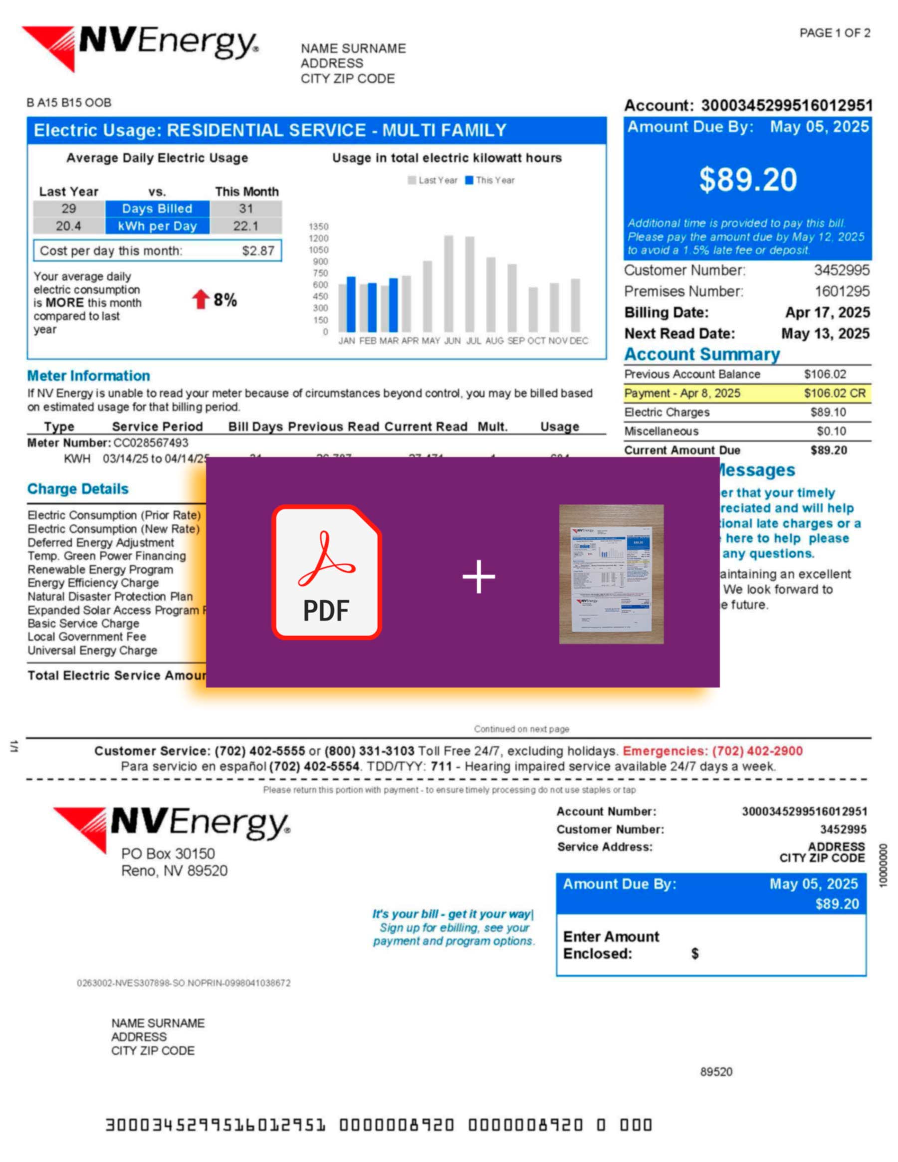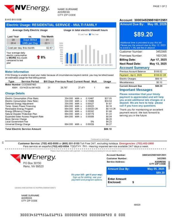Included formats: JPEG or PDF + JPEG, all in 300 DPI print-ready resolution. The NV Energy layout is faithfully recreated for Nevada, featuring editable elements such as account name, address, billing period, meter readings, and totals. Each purchase includes free revisions until approved, guaranteed 24-hour delivery, secure checkout, and dedicated 24/7 support for any assistance you may need.