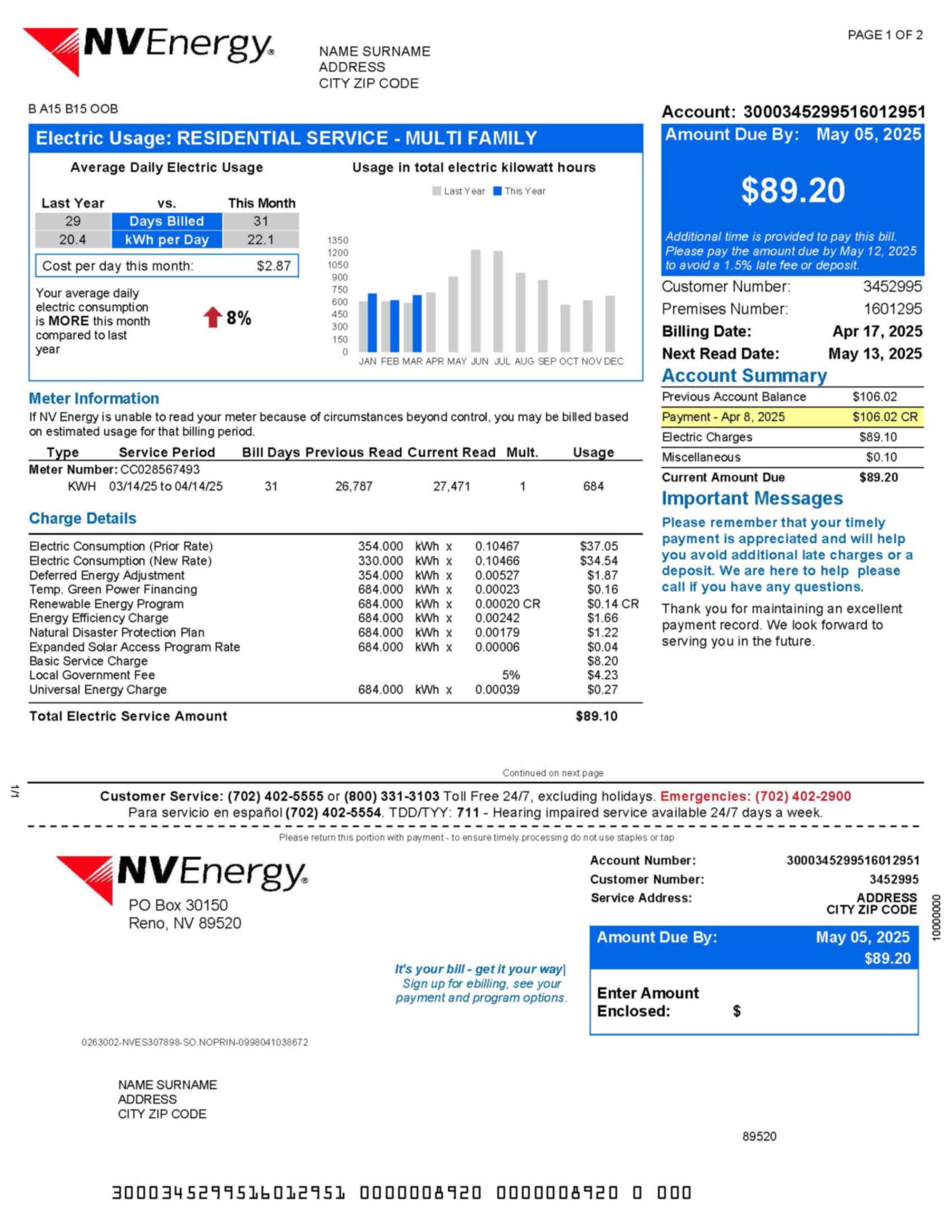 Editable areas include customer name, billing period, usage data, and total charges. The format maintains NV Energy’s authentic layout and works seamlessly with Photoshop or any PDF editing software. The output remains at 300 DPI for professional clarity and printing accuracy.