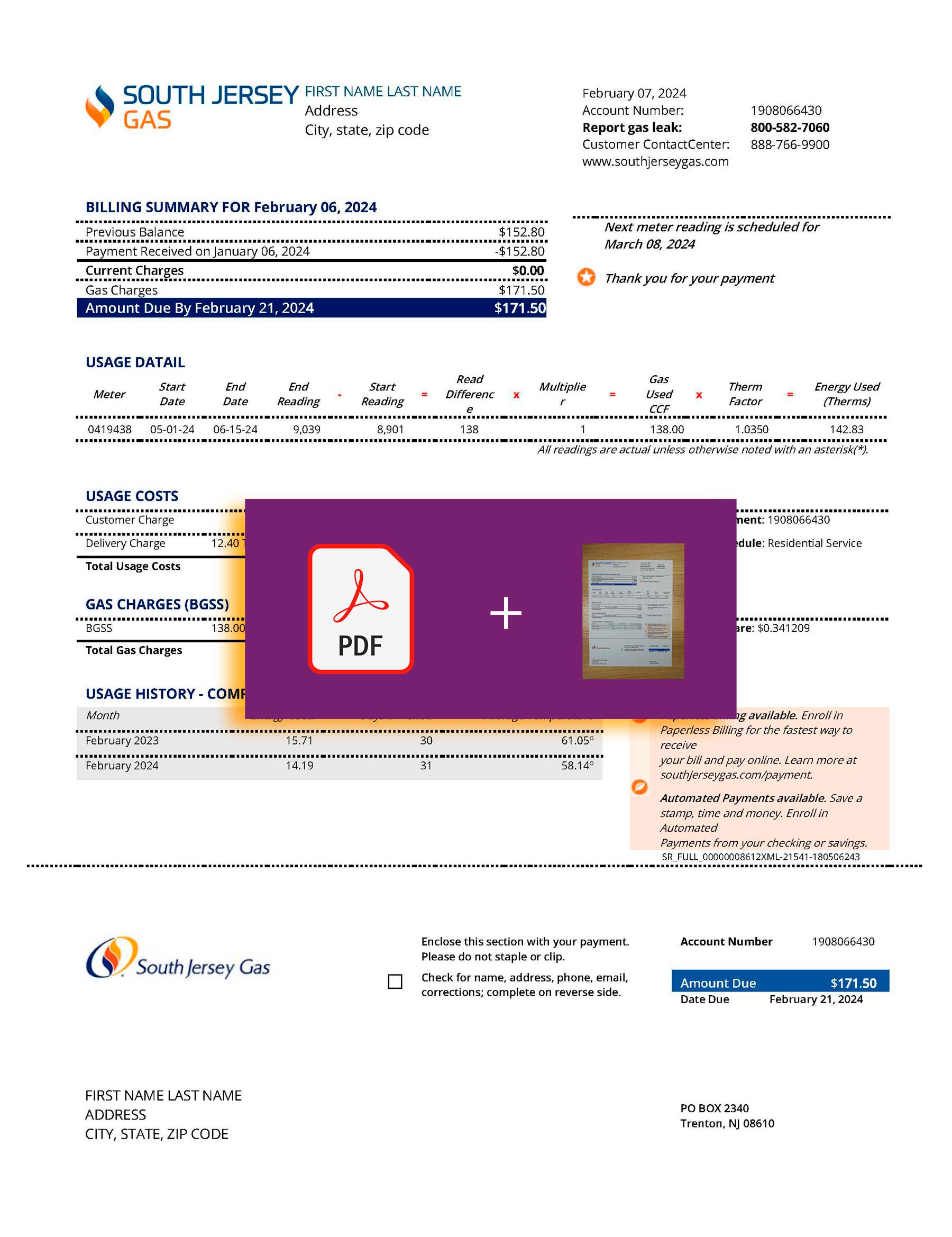 You can edit customer details, billing period, usage, and totals. The layout preserves the New Jersey utility format and is fully compatible with Adobe Acrobat, Photoshop, and other PDF editors while maintaining a crisp 300 DPI quality.