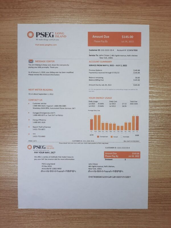 This editable PSEG Electric utility bill template follows the 2025 New Jersey layout with precise attention to billing cycle details, totals, and usage breakdown. Created in 300 DPI high resolution, it’s ideal for professionals, designers, and verification teams needing realistic statement visuals for POA (Proof of Address), KYC compliance, or documentation demos. Each section—from account summary to meter readings—is editable and follows a Done-For-You approach, ensuring accuracy and ease of use.