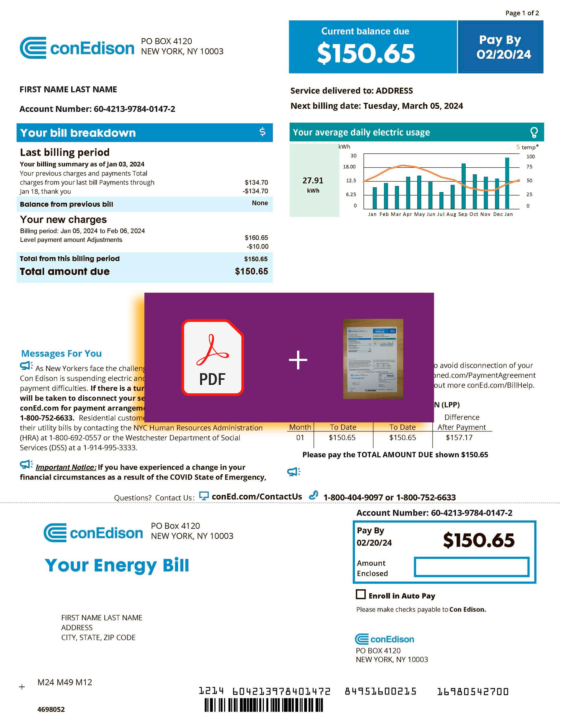 The package includes both PDF and JPEG files at 300 DPI resolution. Each file mirrors Con Edison’s standard New York layout, featuring editable fields such as account name, service address, billing dates, and total charges. You’ll receive free revisions until you approve the design, fast delivery within 24 hours, secure checkout, and 24/7 customer support to ensure a smooth and professional experience.